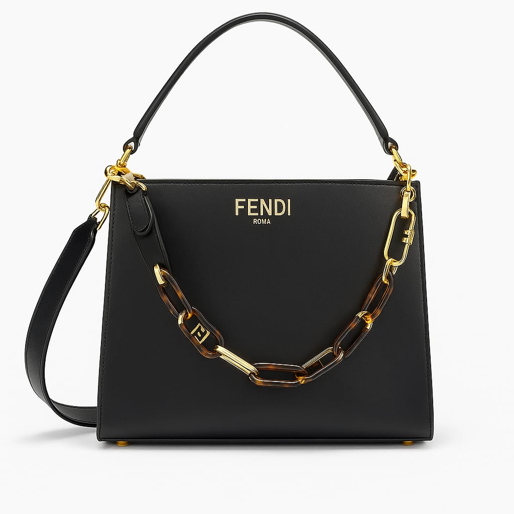 Accessories: Features a short top handle, a long adjustable and detachable shoulder strap, and a modern front chain with oversized tortoiseshell-effect links combined with gold-tone accents. The front is adorned with the bold FENDI ROMA logo in gold.