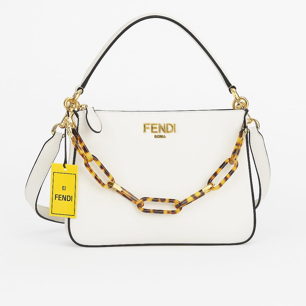 الإكسسوارات: مزودة بحزام يد قصير وحزام كتف طويل قابل للفك والتعديل، وسلسلة أمامية عصرية بتصميم حلقات كبيرة بلون التورتويز مع لمسات معدنية ذهبية، بالإضافة Fendi ROMAإلى شعار البارز باللون الذهبي في المقدمة.