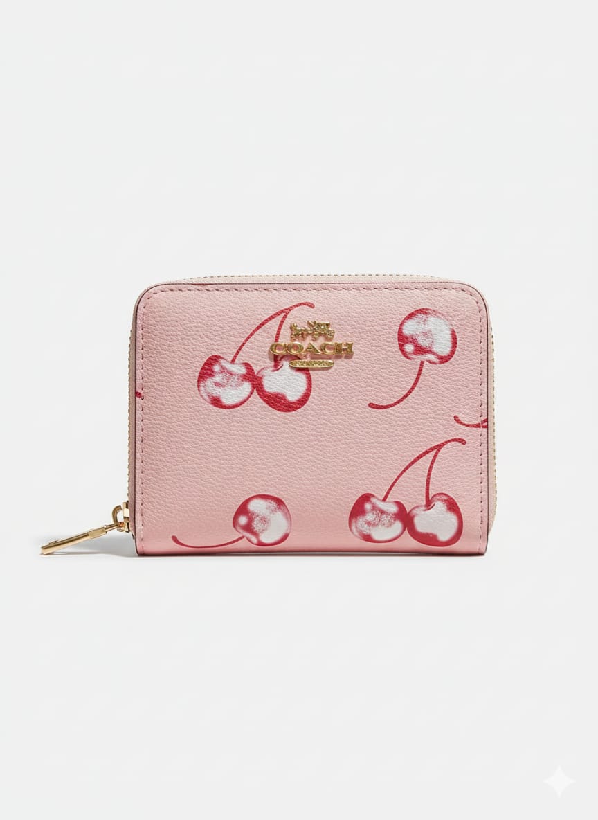 The wallet comes in multiple playful and stylish prints including cherries, lips, strawberries, and honey bees, each design adding a unique flair that blends youthful spirit with luxury.