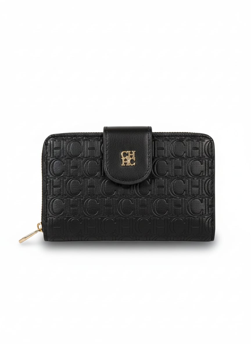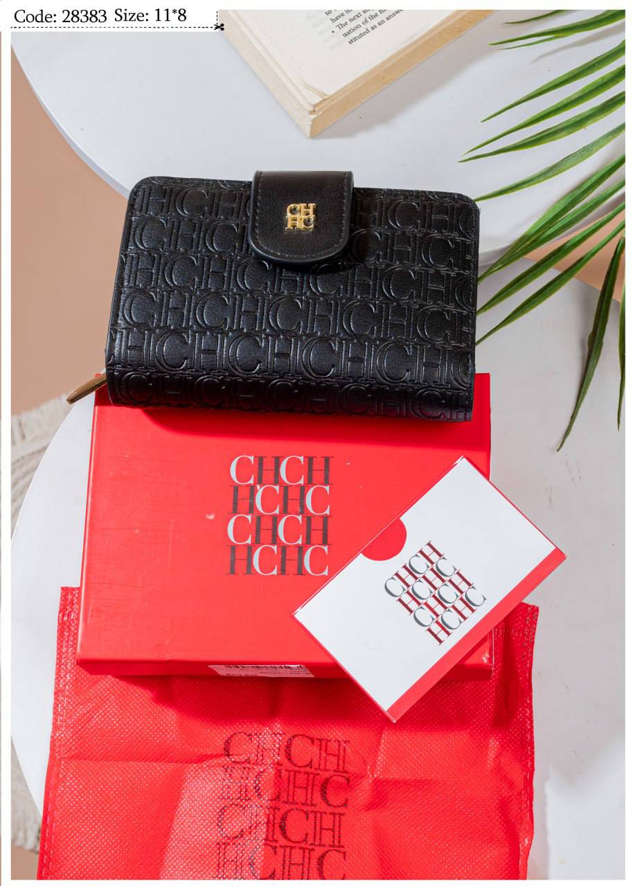 Crafted from premium-quality material with the signature repeating CH pattern, this wallet stands out with a luxurious and fashionable appearance. The front flap is designed with a sleek closure accented by a gold-tone CH logo, adding a sophisticated finishing touch.