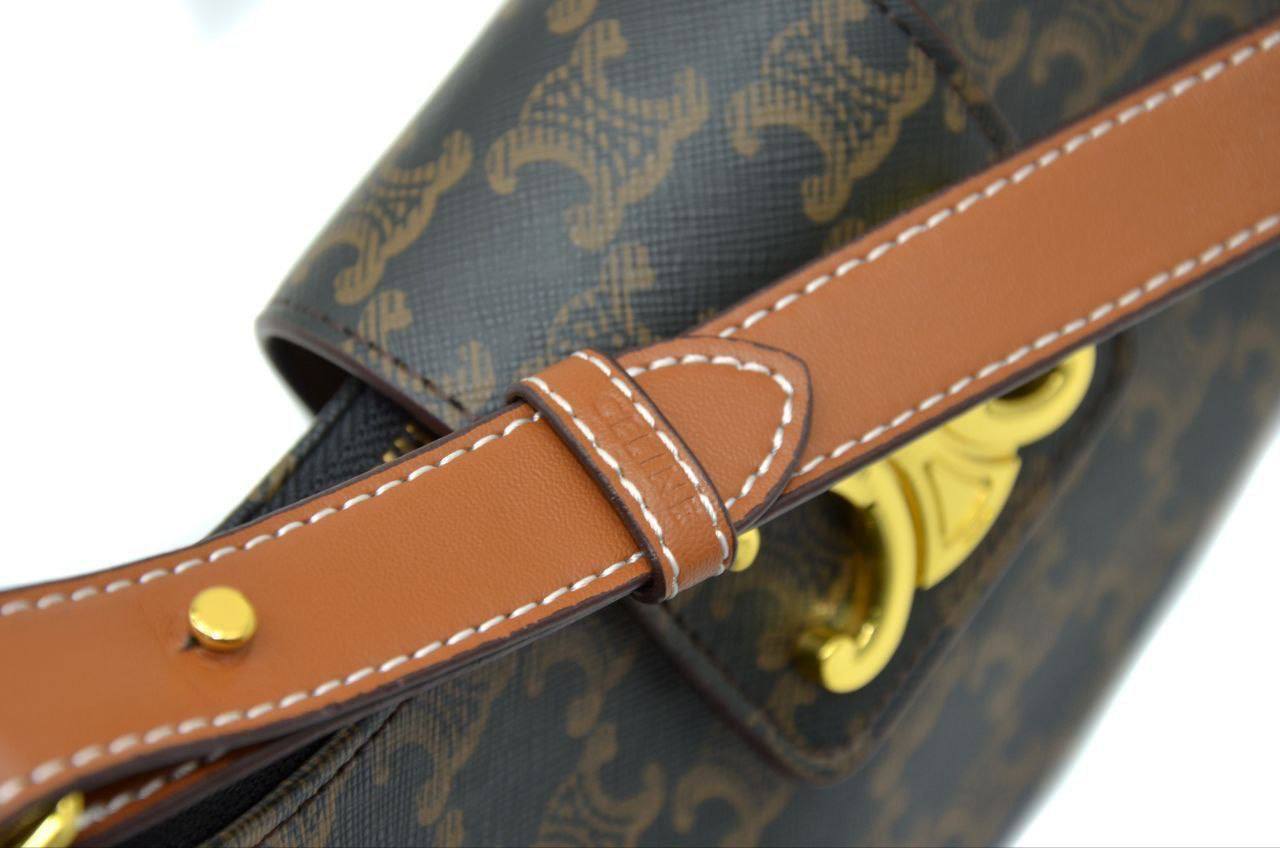 مصنوعة من خامة جلد فاخر مطبوع بشعار Celine المميز، مع قفل معدني باللون الذهبي يضيف لمسة فخامة.