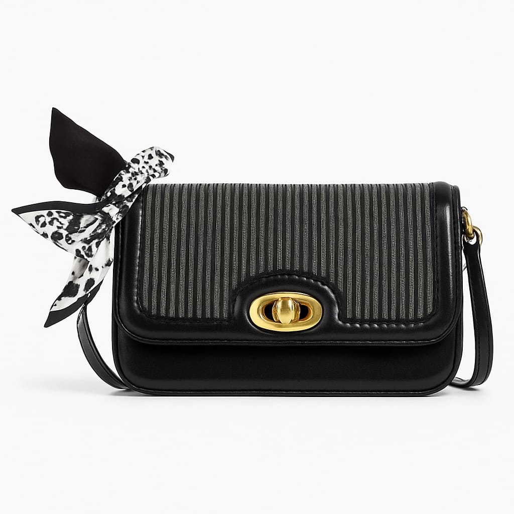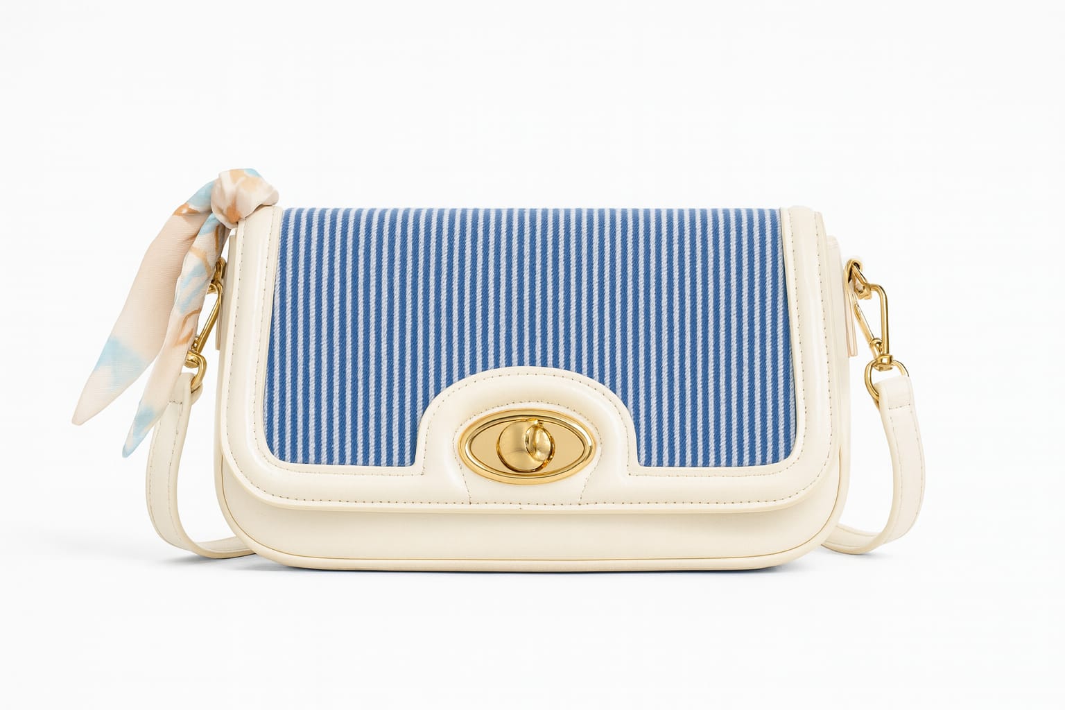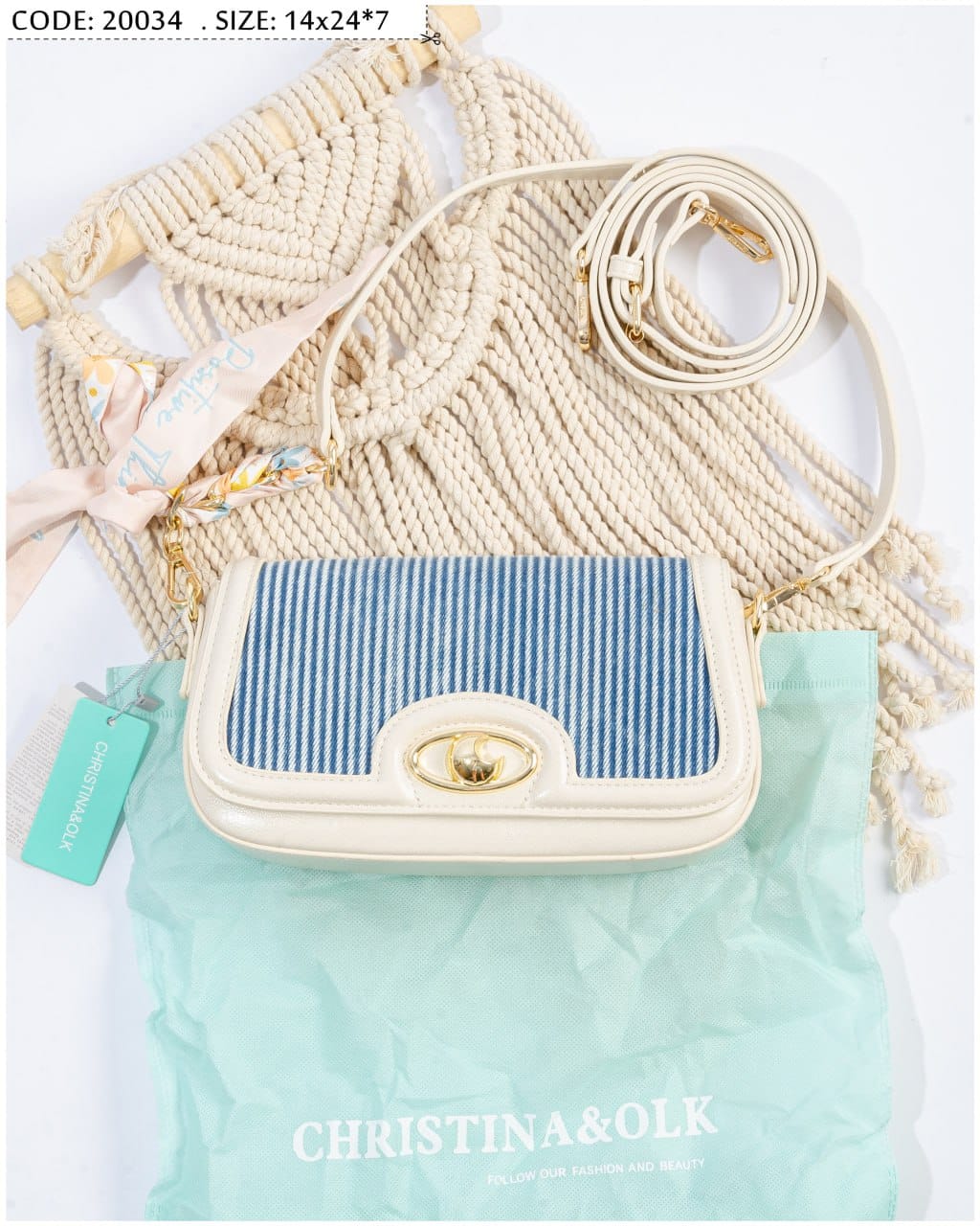 The Christina & OLK Imported Crossbody Bag (Code: 20034) is the perfect blend of elegance and practicality. Crafted from premium materials, it features a striped fabric front with a luxurious leather frame and a chic gold-tone twist lock closure. Its ideal size (14×24×7 cm) makes it spacious enough for your essentials such as phone, wallet, and small accessories, while remaining sleek and lightweight. The adjustable shoulder strap allows versatile styling – wear it as a crossbody for casual outings or as a shoulder bag for a refined look. Available in two timeless color combinations (Off-white × Blue Stripes / Black × Grey Stripes), this bag is a must-have piece for every modern woman’s wardrobe.