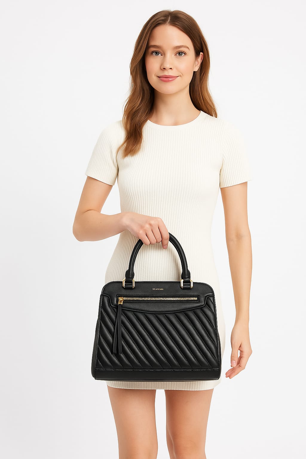 Imported luxury handbag crafted from premium faux leather in a timeless classic black color, accented with gold hardware.