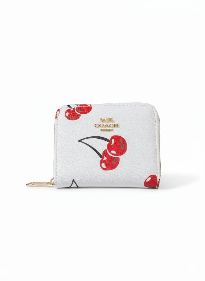 The wallet comes in multiple playful and stylish prints including cherries, lips, strawberries, and honey bees, each design adding a unique flair that blends youthful spirit with luxury.