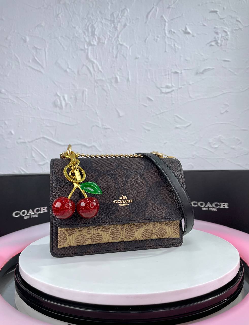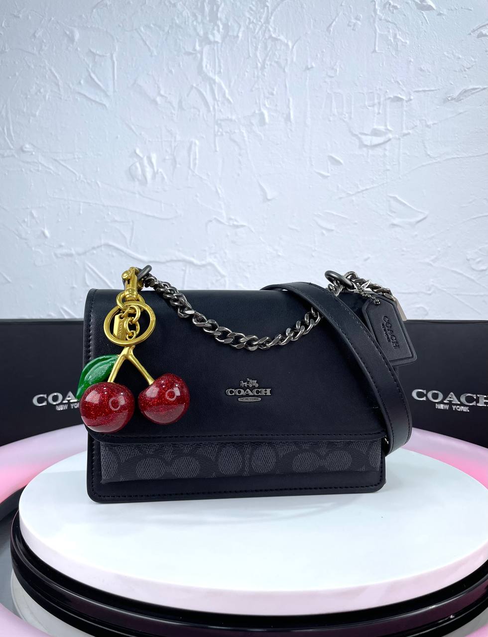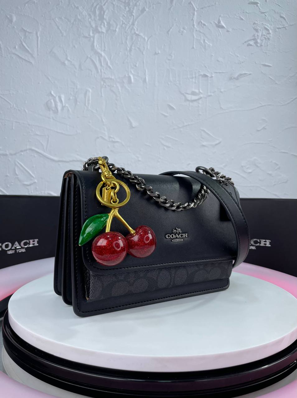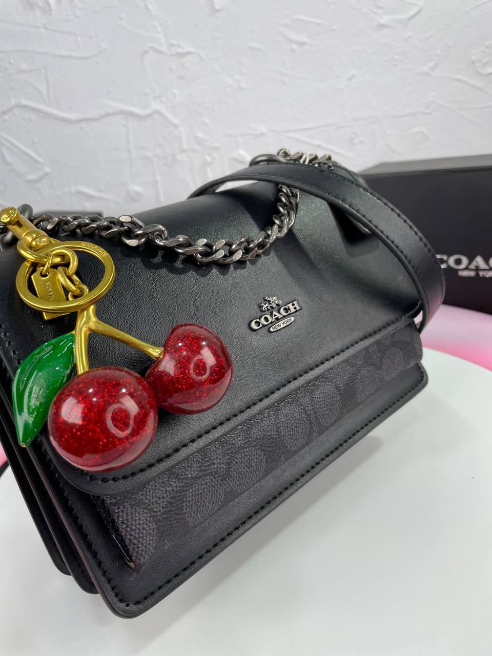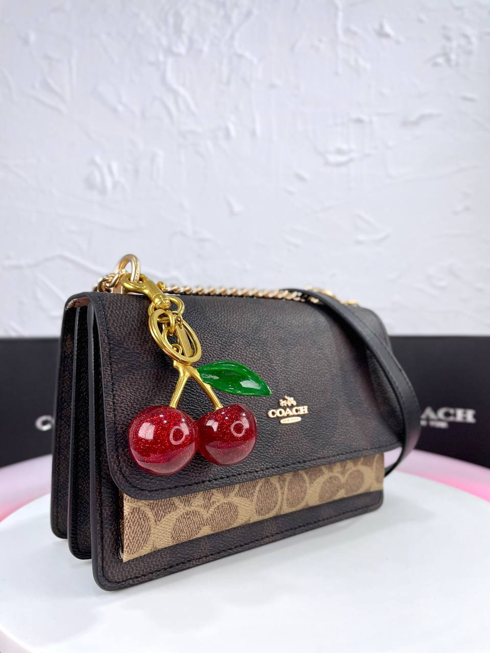 Elegant glossy cherry detail with Coach logo adds charm.