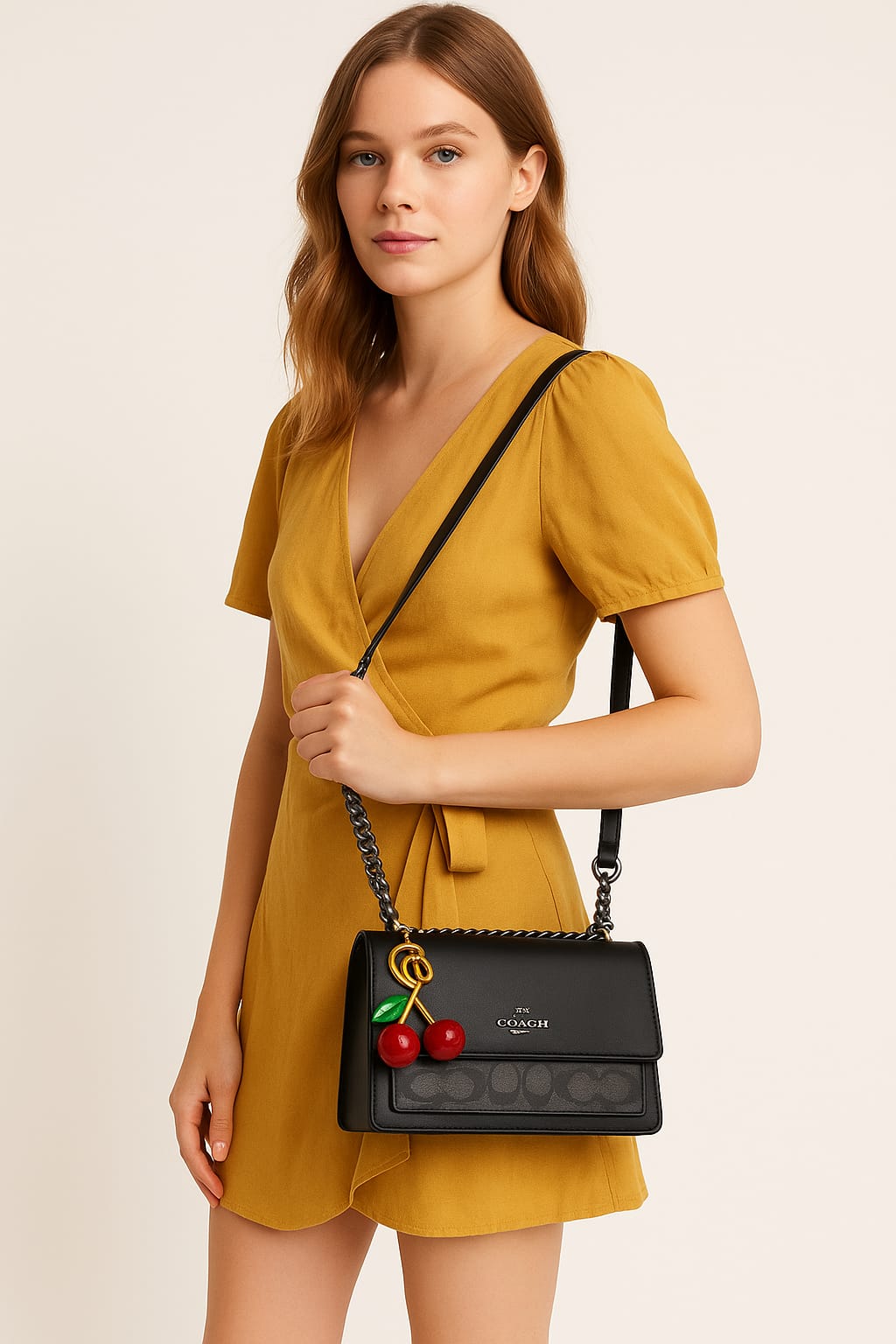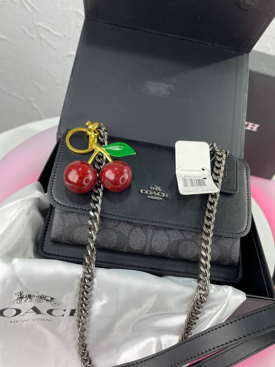 The front is adorned with charming, glossy cherry detail paired with the refined Coach metal emblem—adding a playful yet elegant touch. Delivered with a luxury original box, this bag makes a perfect gift or a standout piece for your collection.