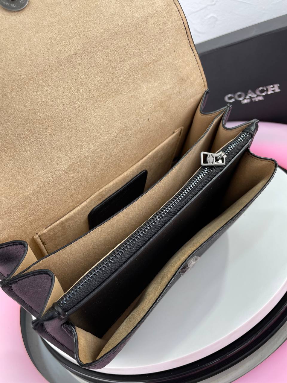 تفاصيل كرز لامع مع شعار Coach ذهبي تضيف لمسة جمالية جذابة.