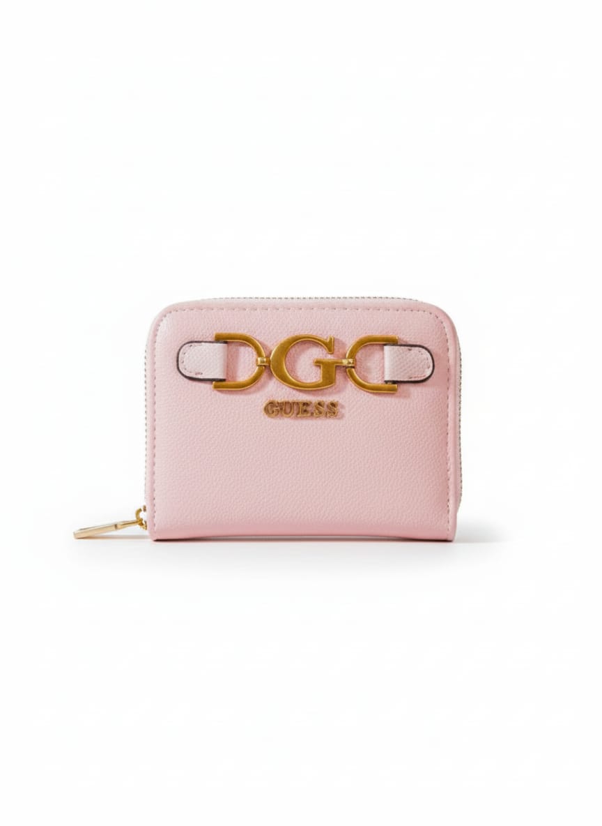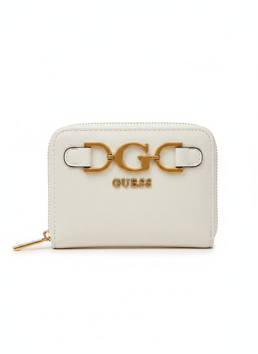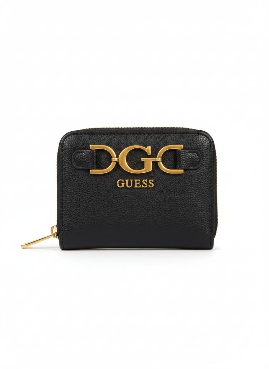 اللمسة الذهبية الأيقونية: يبرز التصميم بقطعة معدنية ذهبية ضخمة على شكل حرفي “G” متصلين، وهو شعار GUESS المميز، مع شريطين جلديين صغيرين باللون الأبيض (أو حسب لون المحفظة)، مما يضيف عنصراً بصرياً قوياً.