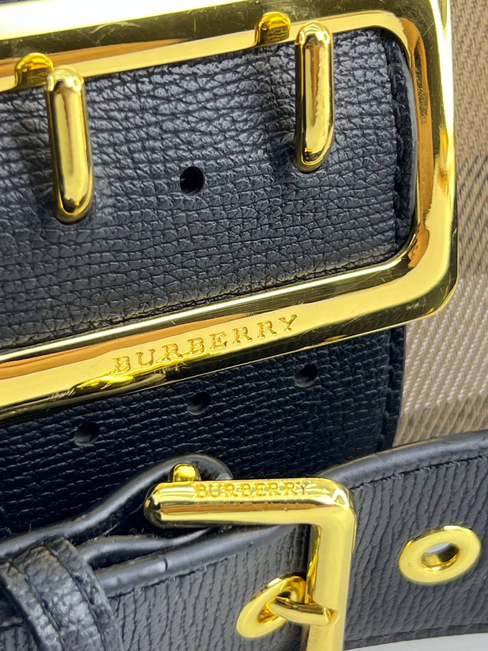 The centerpiece is a gold-tone buckle engraved with the Burberry name, adding a statement of timeless luxury.