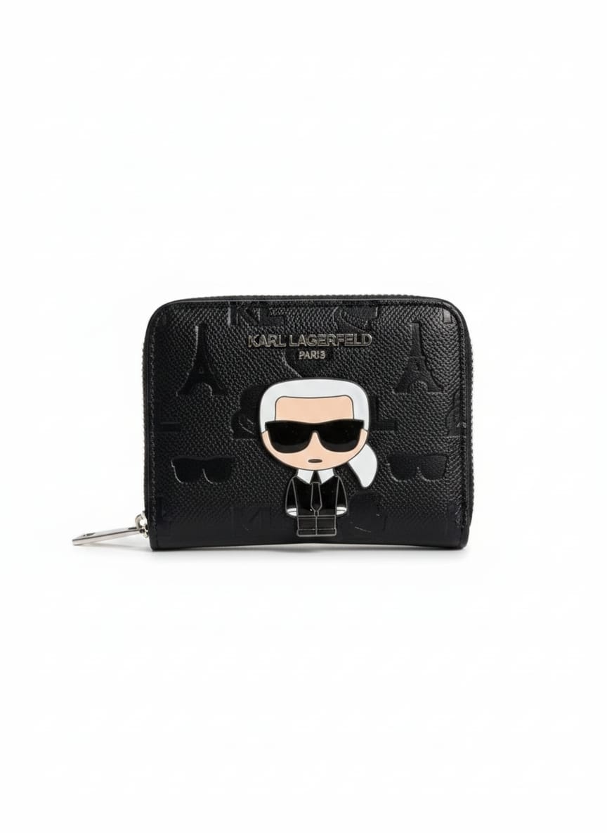 A stylish imported Karl Lagerfeld wallet, crafted with premium textured leather and embellished with elegant embossed patterns inspired by iconic Paris elements such as the Eiffel Tower.