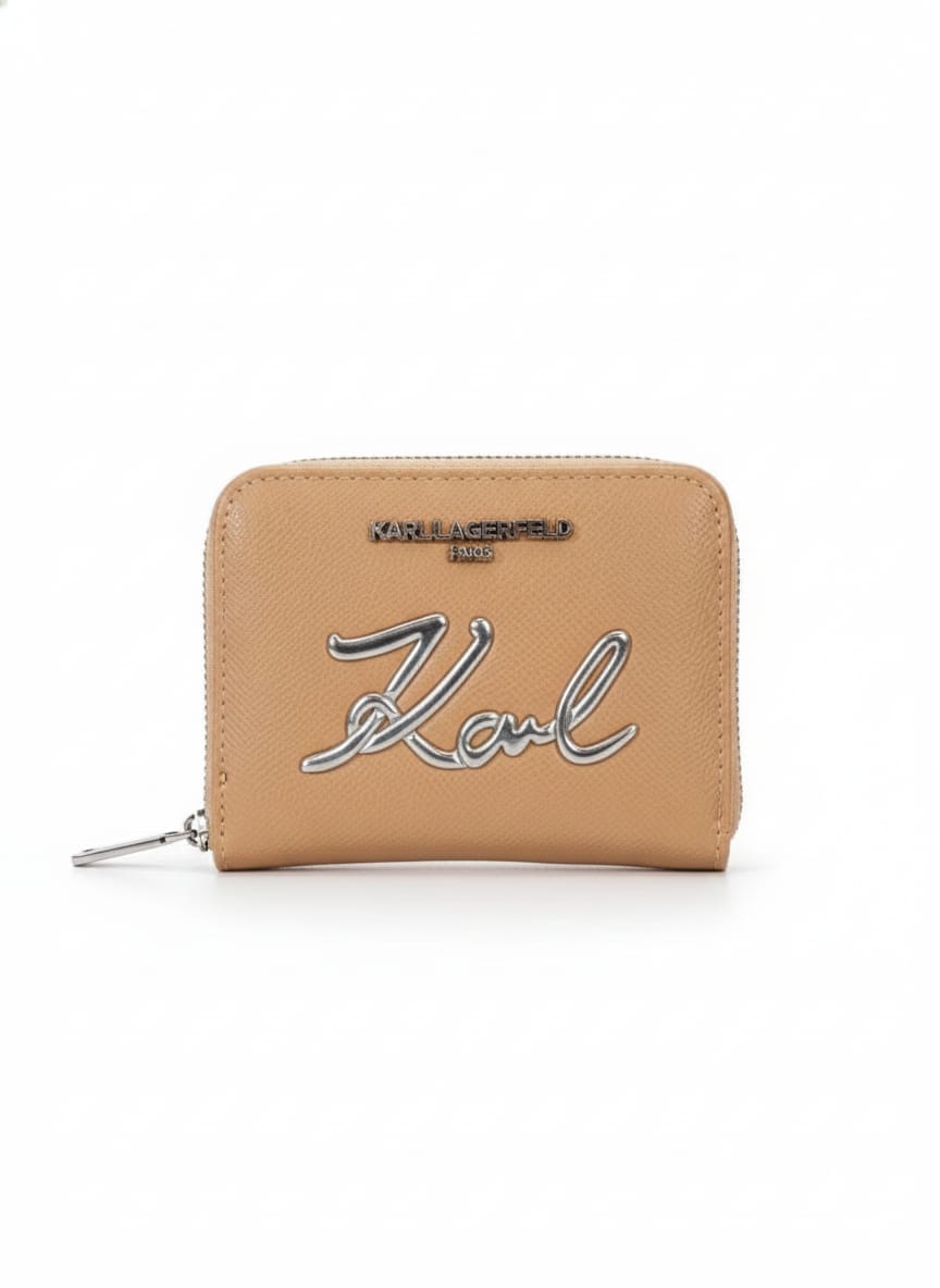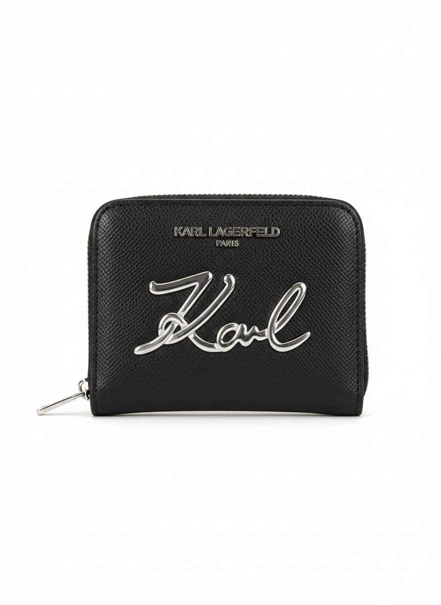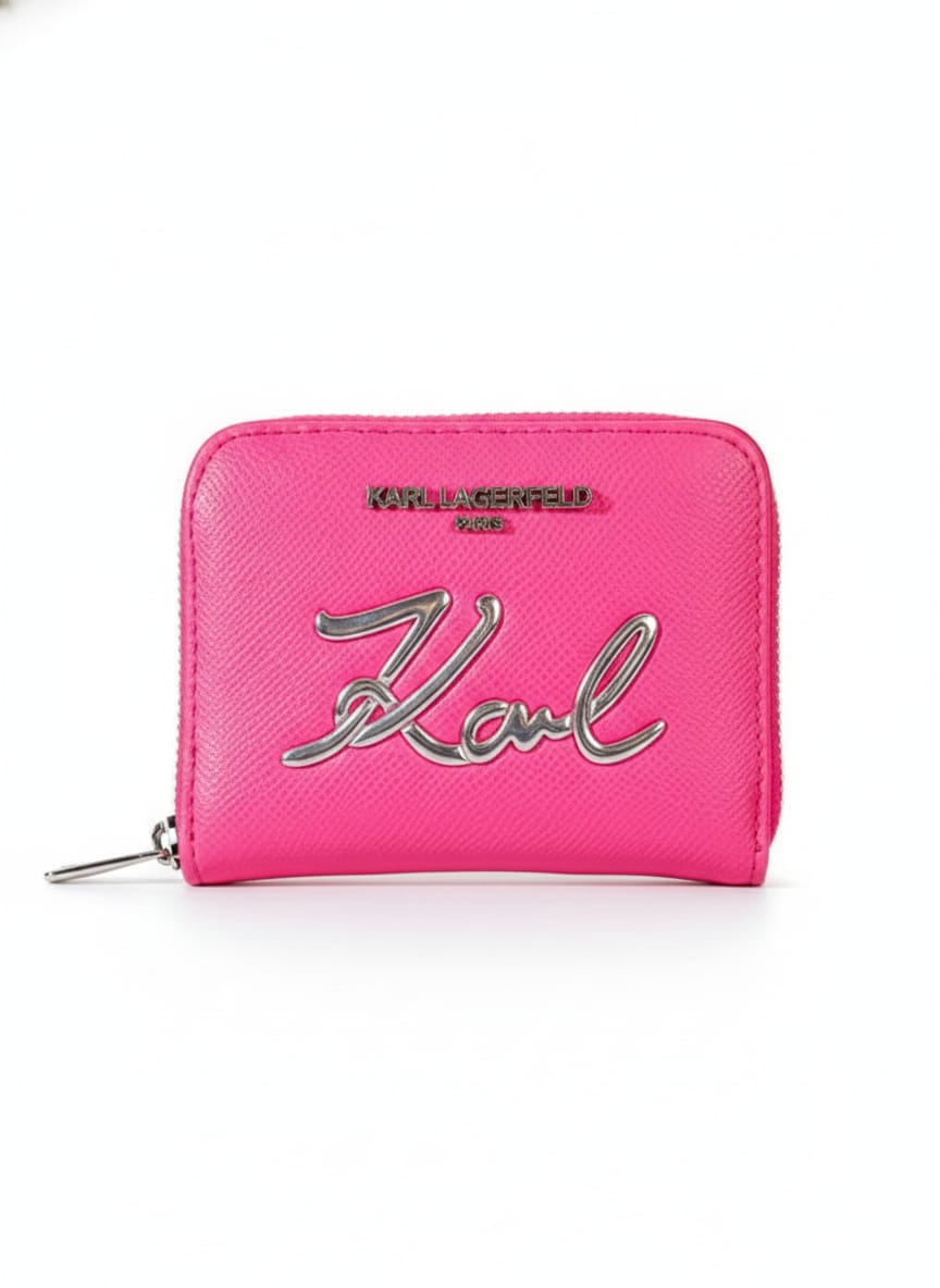 An elegant imported Karl Lagerfeld wallet designed with a modern minimalist aesthetic and highlighted by a bold metallic “Karl” signature on the front.