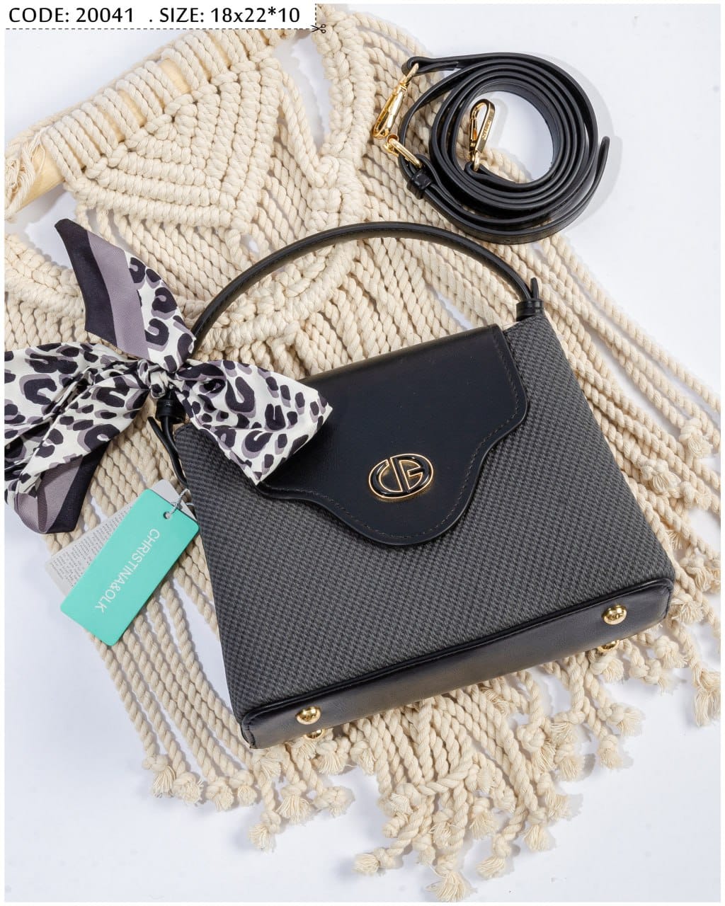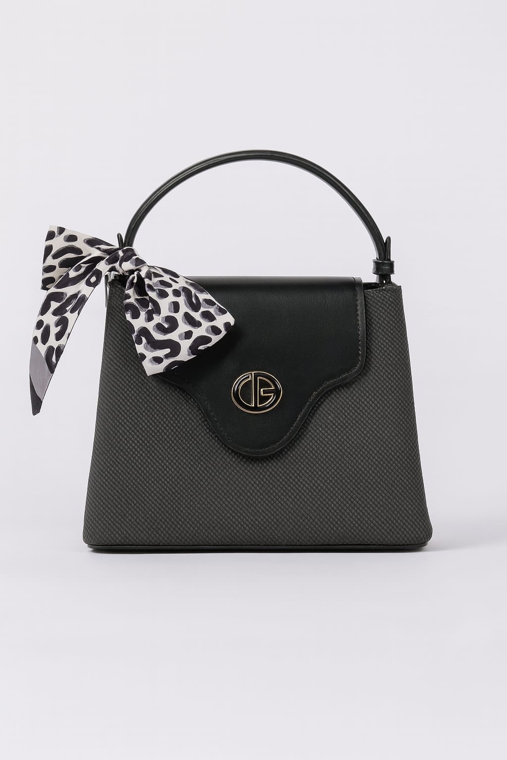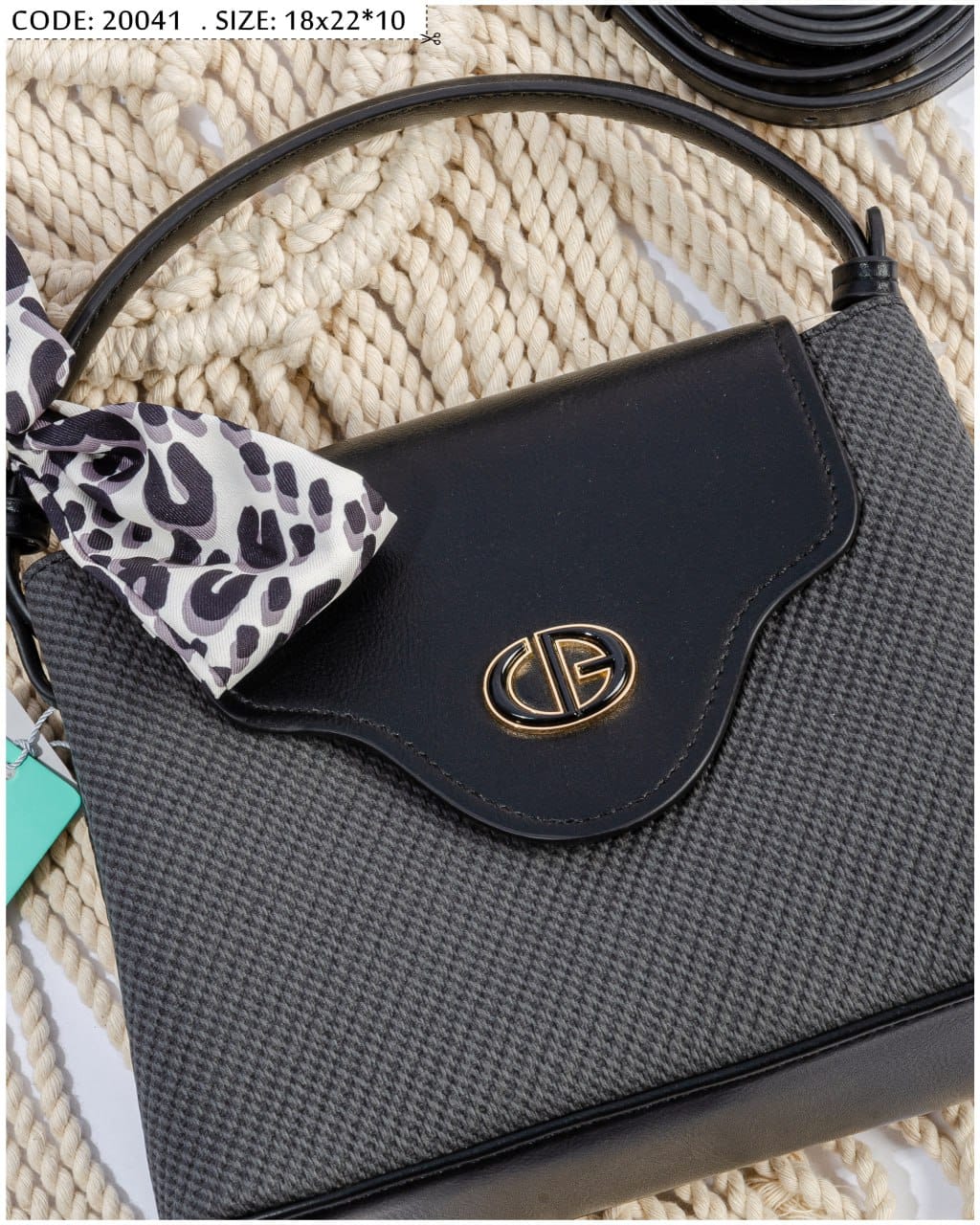 flap مصنوعة من خامة منقوشة راقية باللون الرمادي الداكن مع علوي من الجلد الأسود ومزودة بتفاصيل معدنية ذهبية تزيدها فخامة.