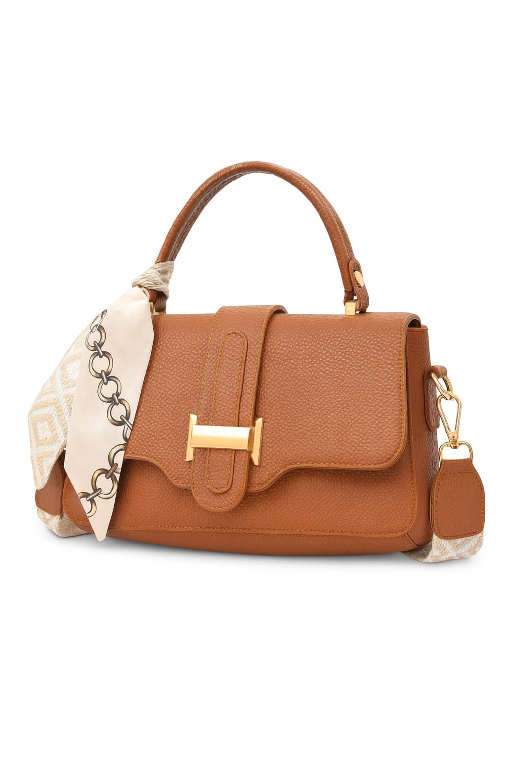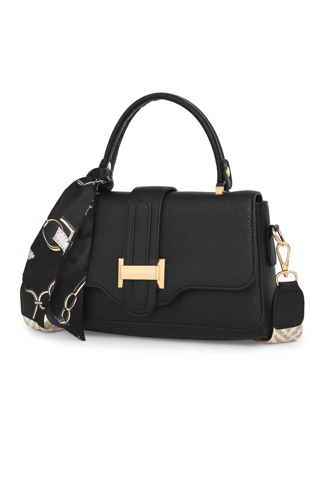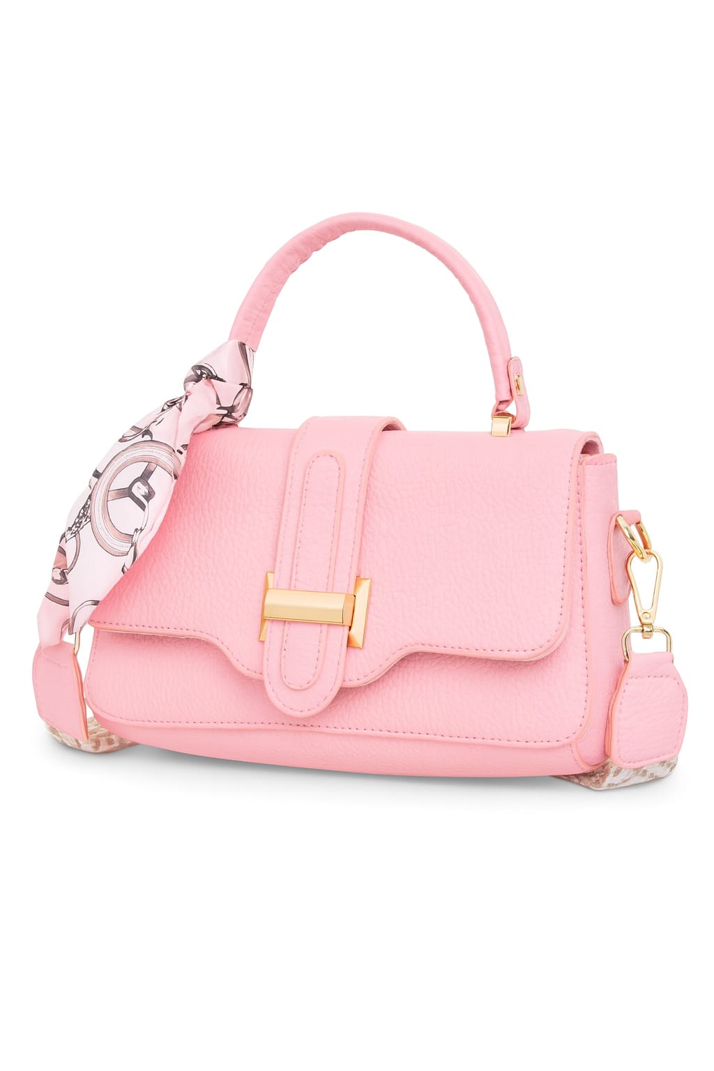 The bag is accented with a glamorous gold-tone front buckle closure and decorated with a silky scarf wrapped around the handle for a feminine, stylish touch.