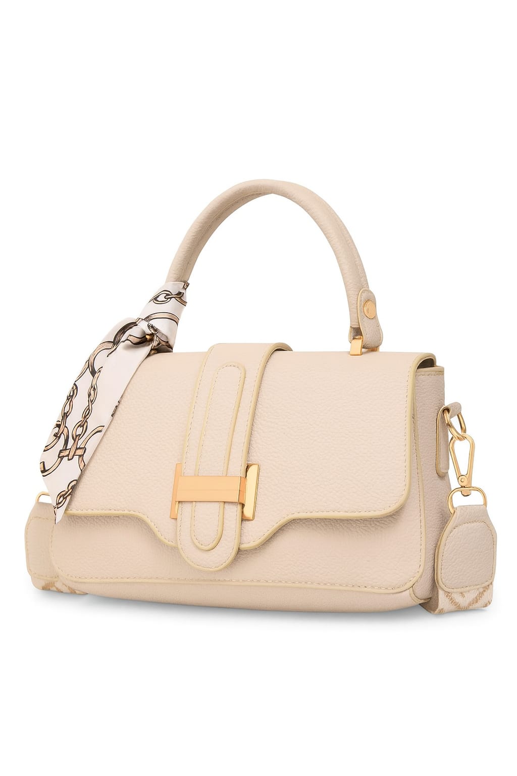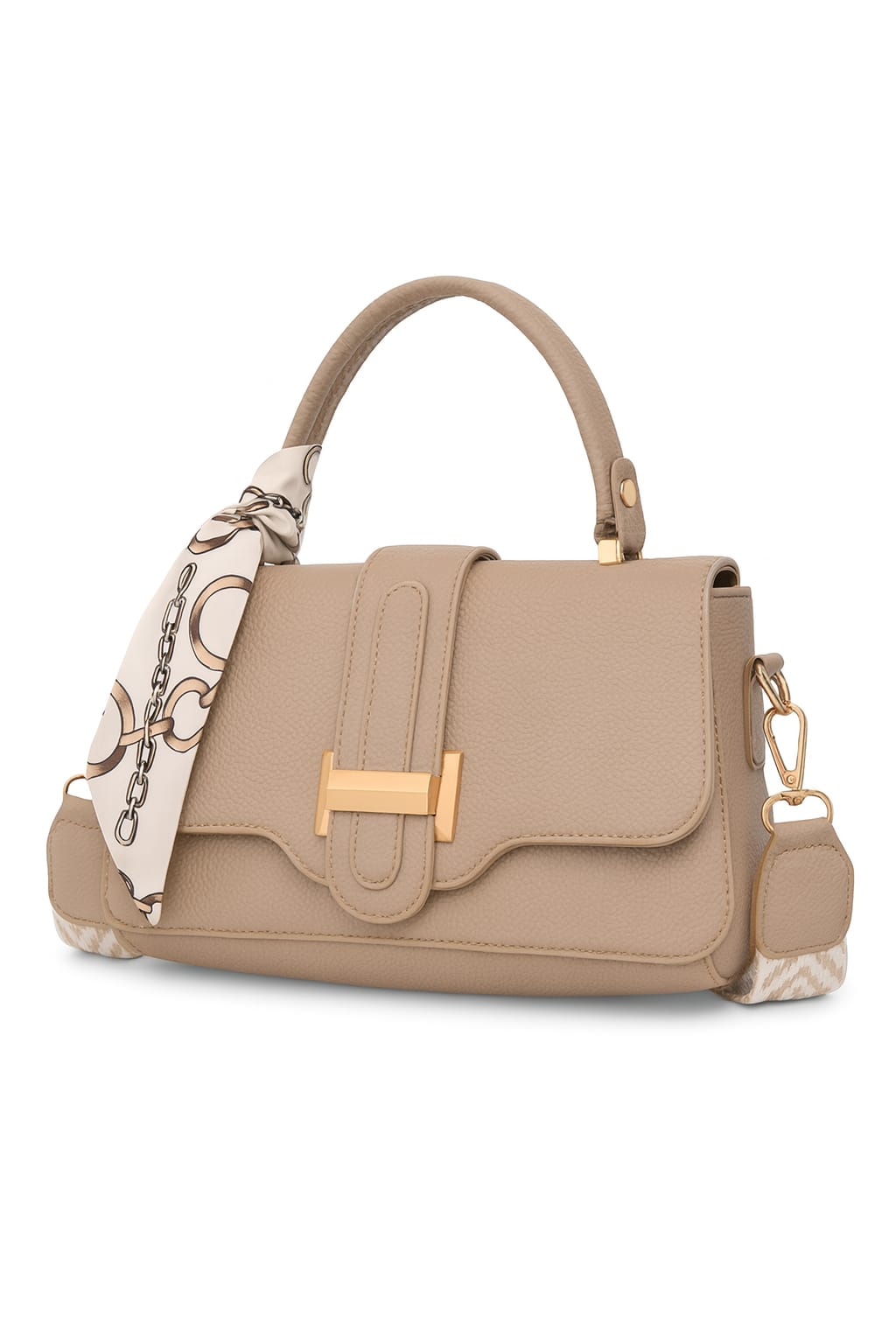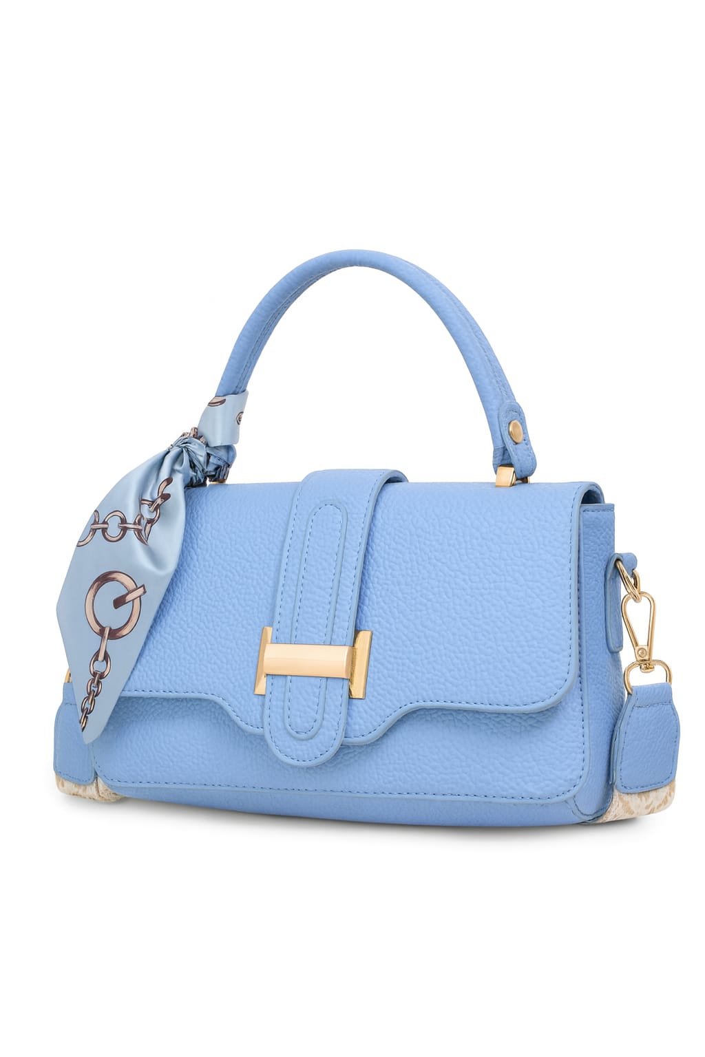 The bag is accented with a glamorous gold-tone front buckle closure and decorated with a silky scarf wrapped around the handle for a feminine, stylish touch.