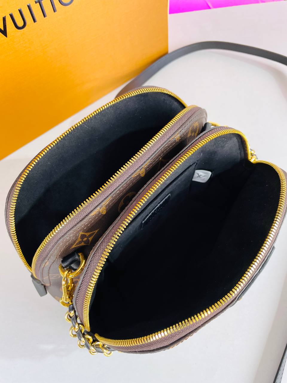 Elevate your everyday look with this LV Monogram Dome Bag, designed in a chic mini silhouette that blends classic luxury vibes with modern practicality. Featuring a refined top handle and an elegant gold chain detail, this bag also comes with a long adjustable strap—perfect to wear as a crossbody or shoulder bag depending on your style.
