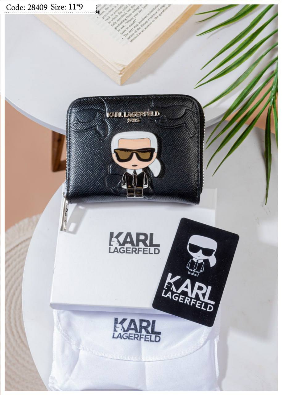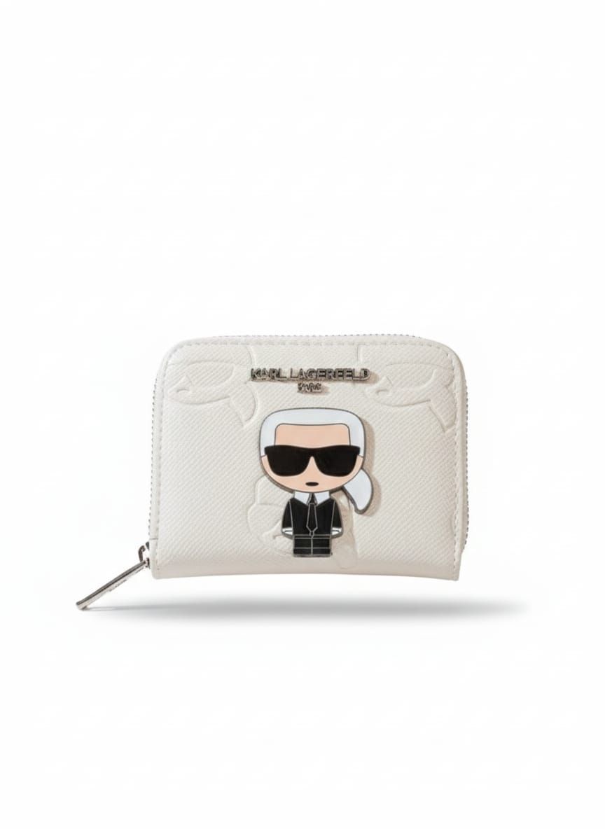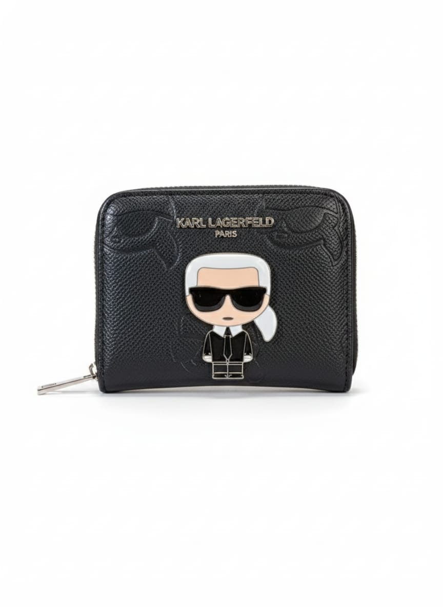 This imported Karl Lagerfeld wallet features a unique design with a stylish 3D character badge on the front, giving it a modern and playful touch. The embossed leather details add elegance and highlight the iconic look of the brand.