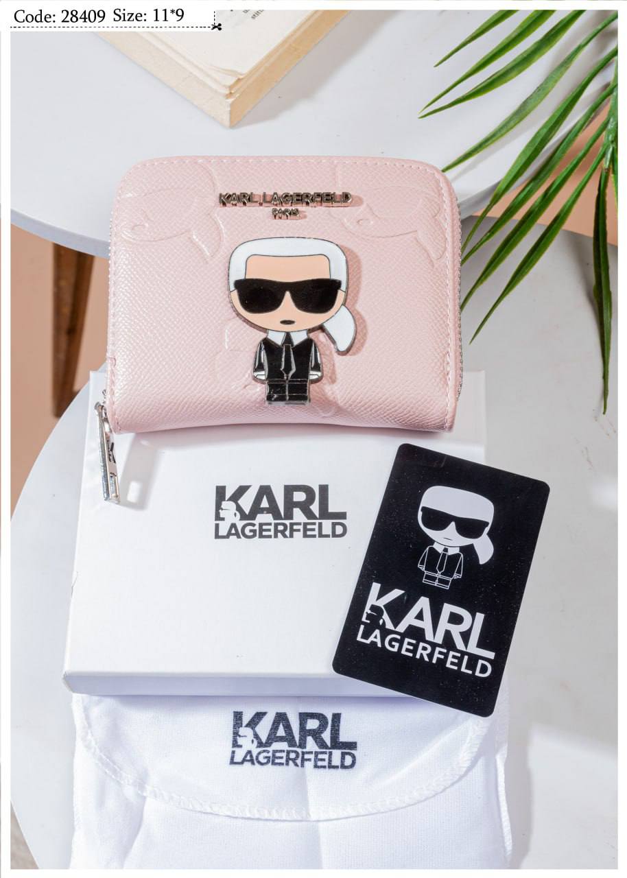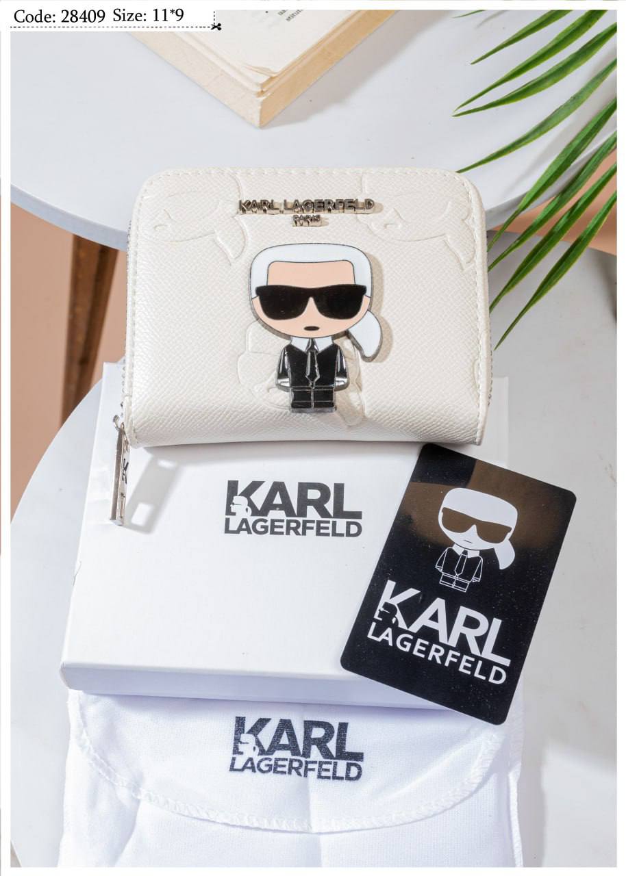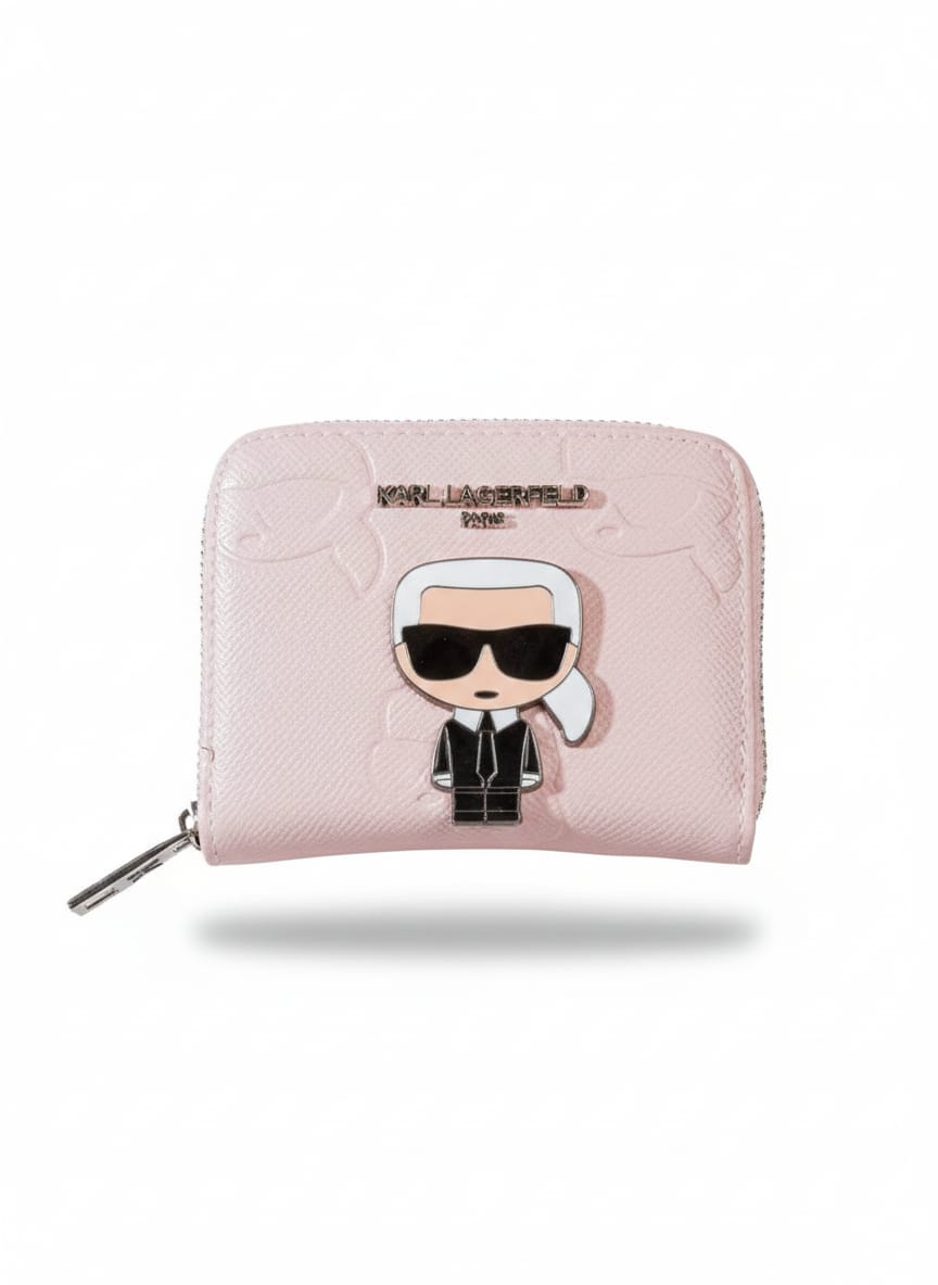 This imported Karl Lagerfeld wallet features a unique design with a stylish 3D character badge on the front, giving it a modern and playful touch. The embossed leather details add elegance and highlight the iconic look of the brand.