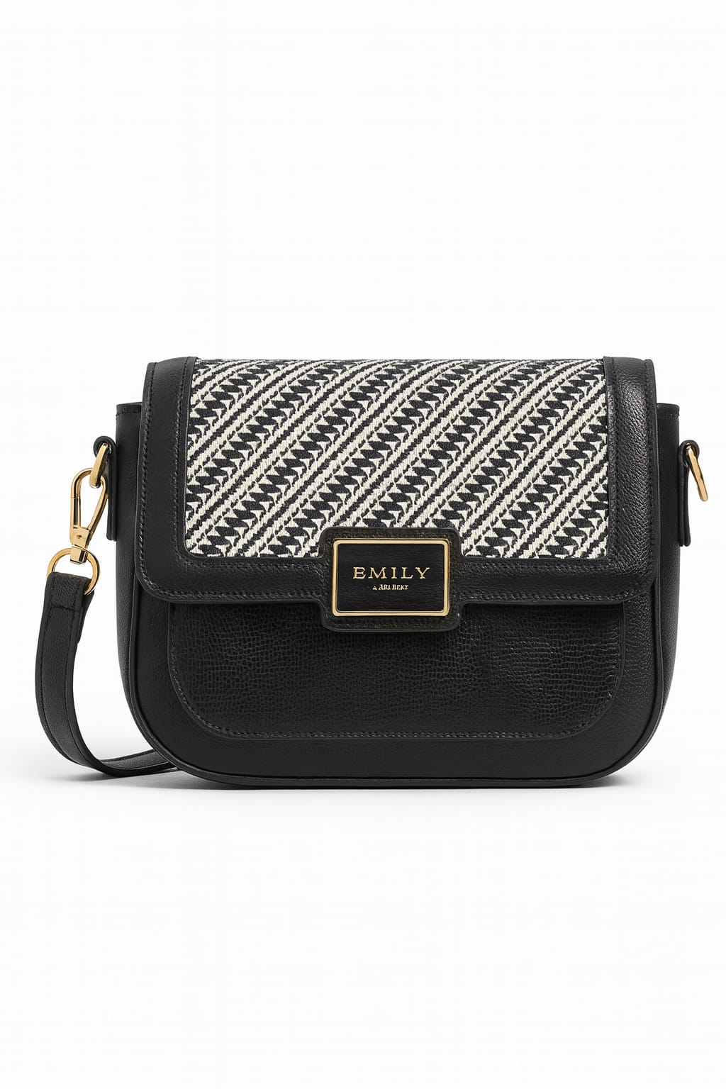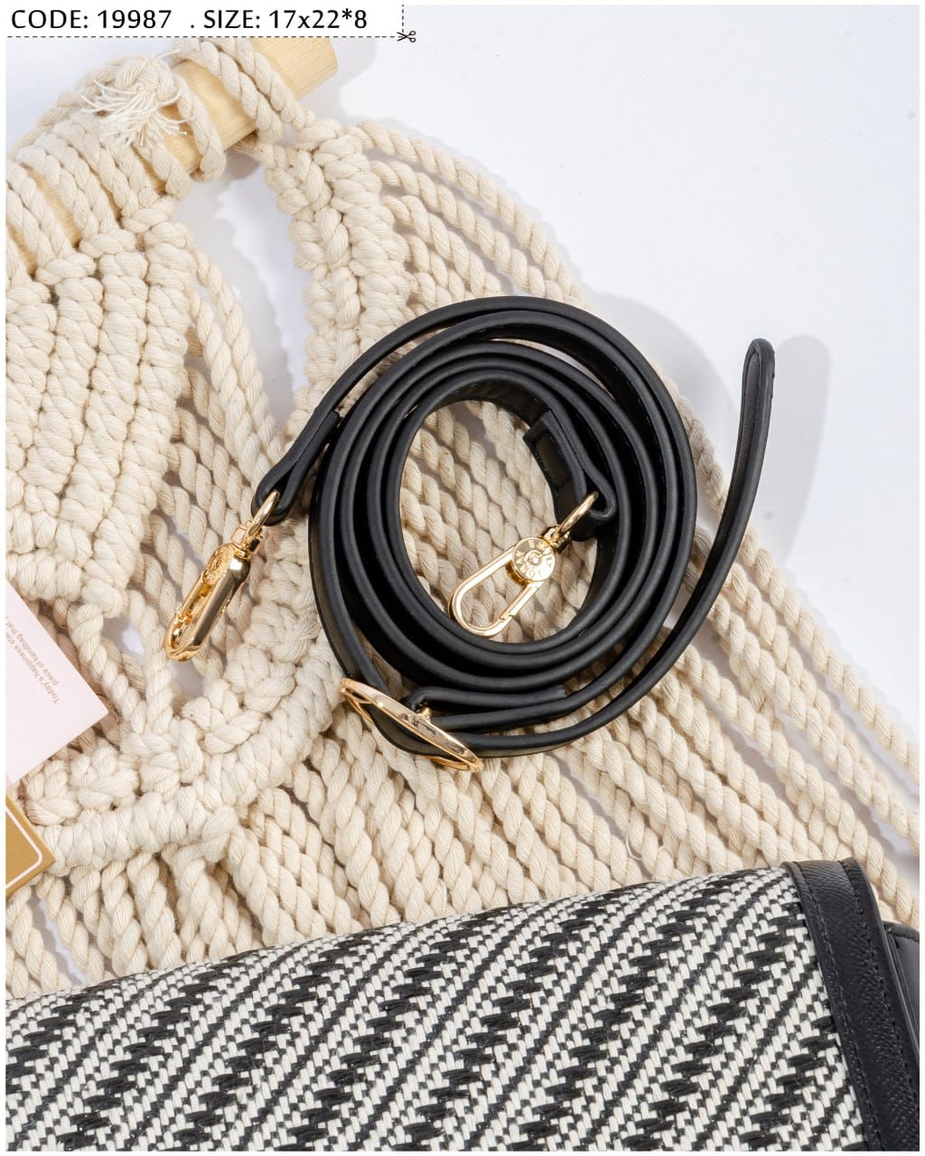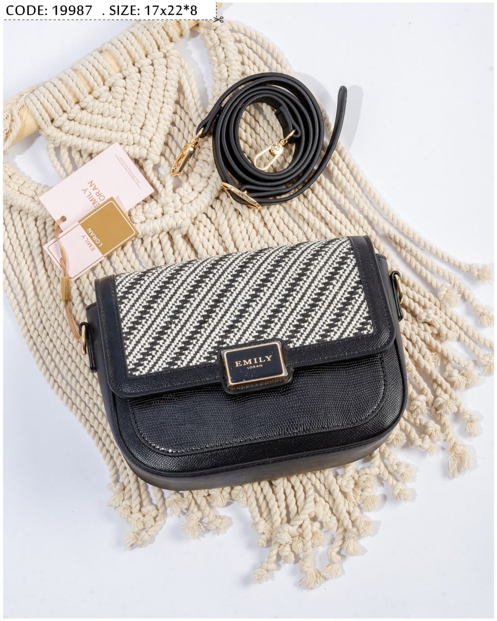 The Emily Loran Imported Crossbody Bag (Code: 19987) combines timeless elegance with everyday practicality. Featuring a premium woven geometric black-and-white front and a refined leather frame, this bag is designed for both style and functionality. Its medium size (17×22×8 cm) provides just the right space for essentials like your phone, wallet, and small accessories. With an adjustable shoulder strap, it offers versatile carrying options for any occasion. A sophisticated design with neutral colors, making it a perfect choice for modern women who value chic practicality.