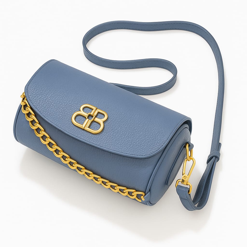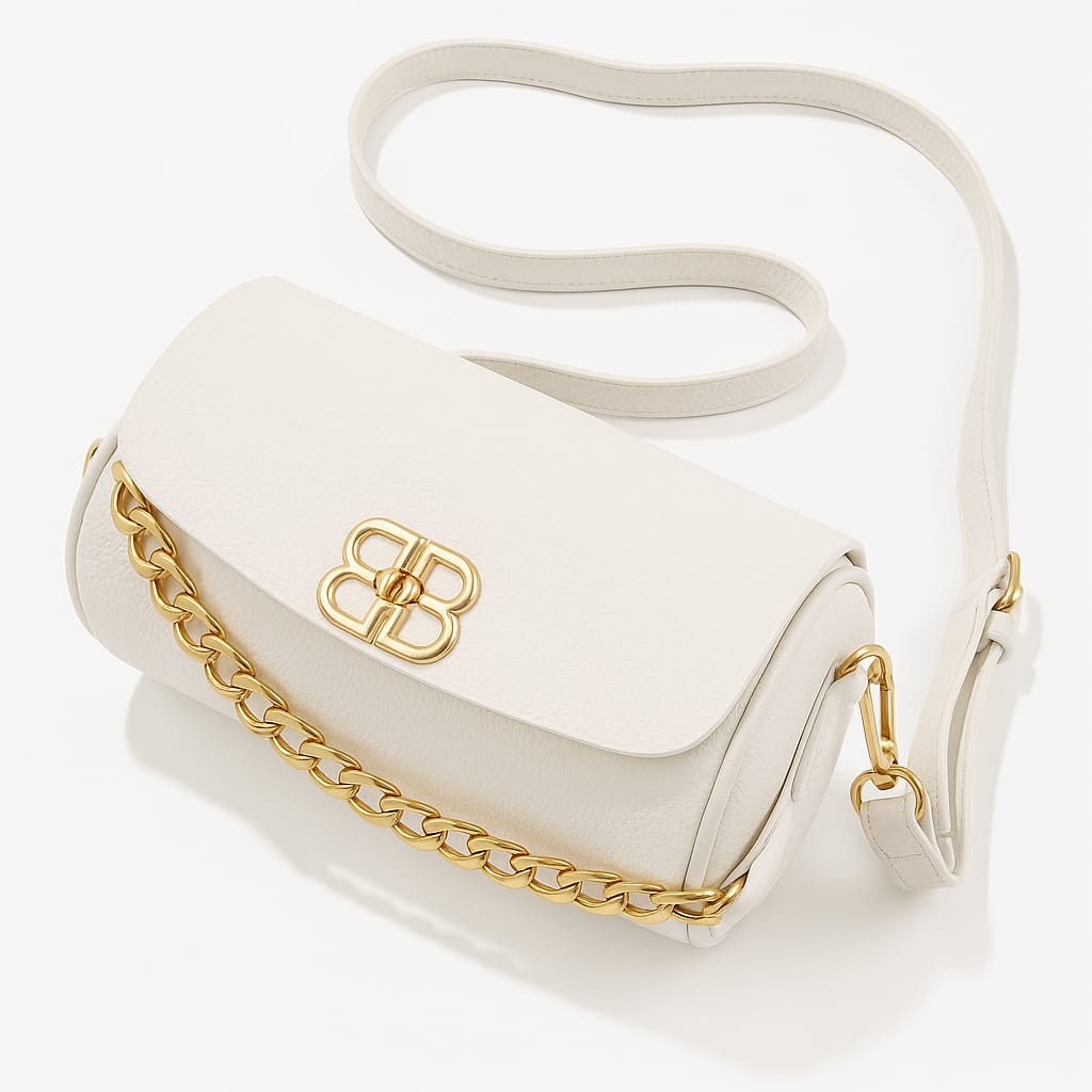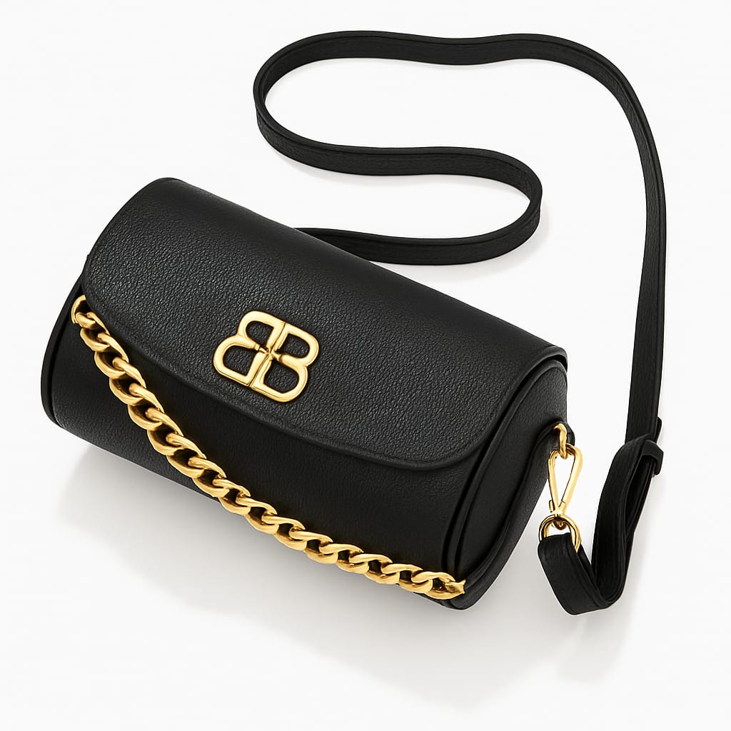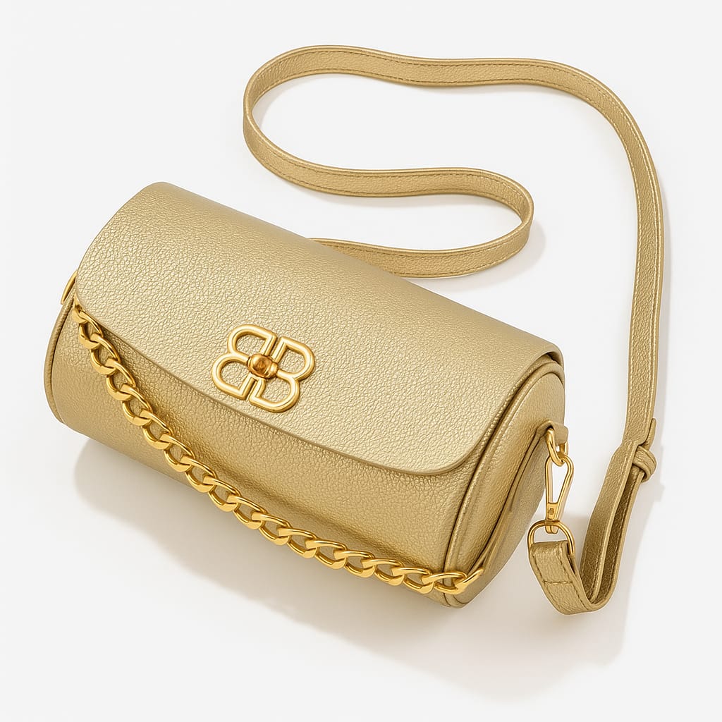 It is complemented with a golden chain handle that can be used as a short carry option or simply as a decorative touch, in addition to an adjustable long strap for crossbody or shoulder wear.