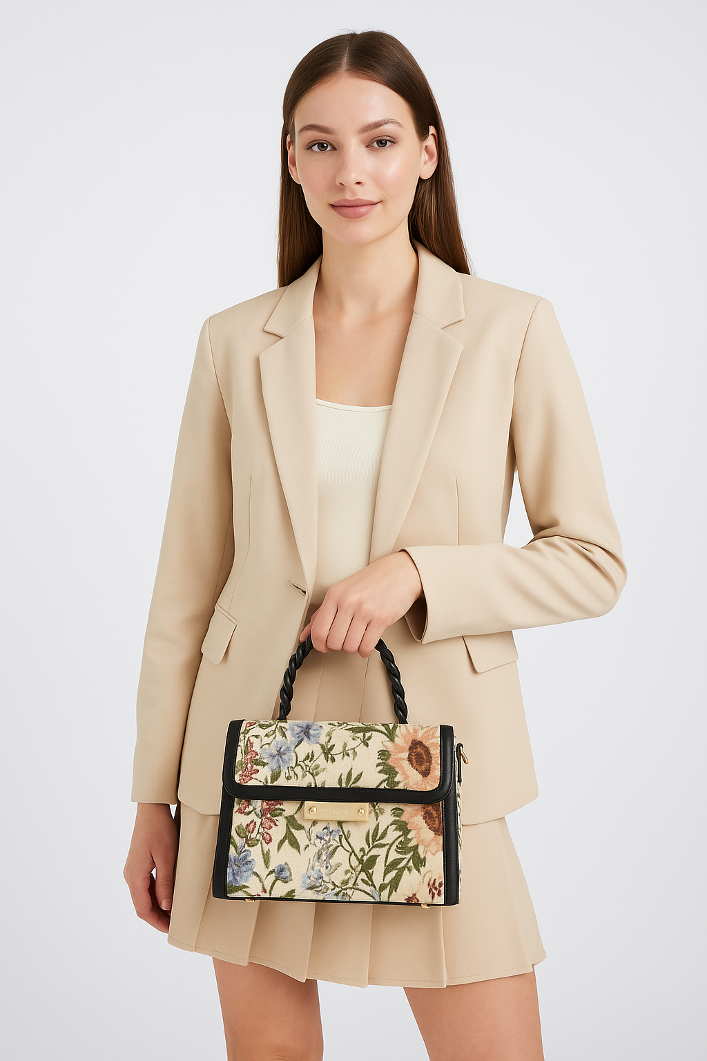 مصنوعة من قماش منقوش برسومات زهرية طبيعية مع حواف جلدية باللون الأسود ولمسات معدنية ذهبية لإطلالة راقية.
