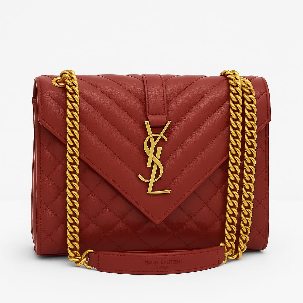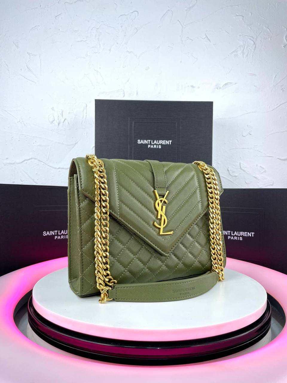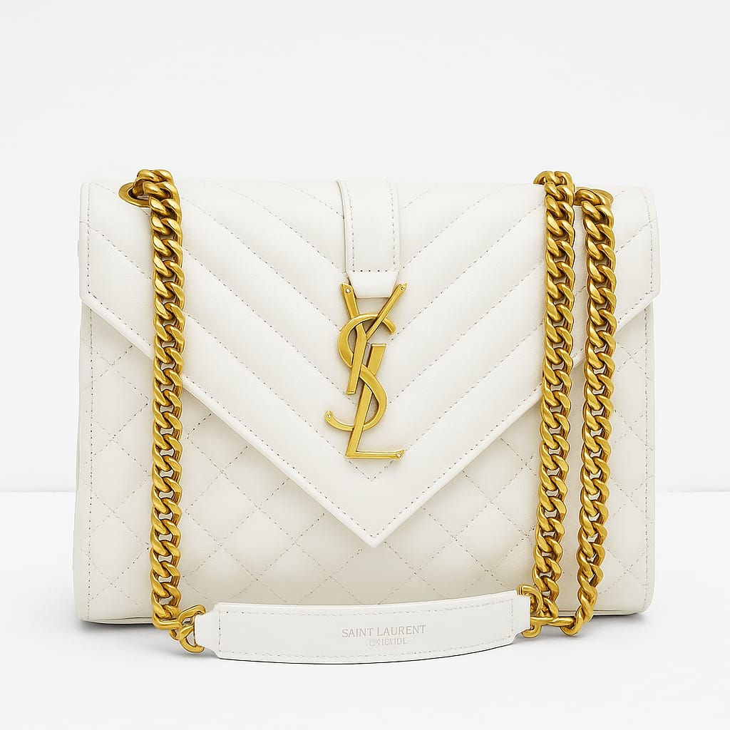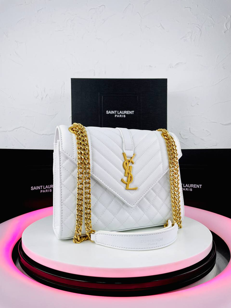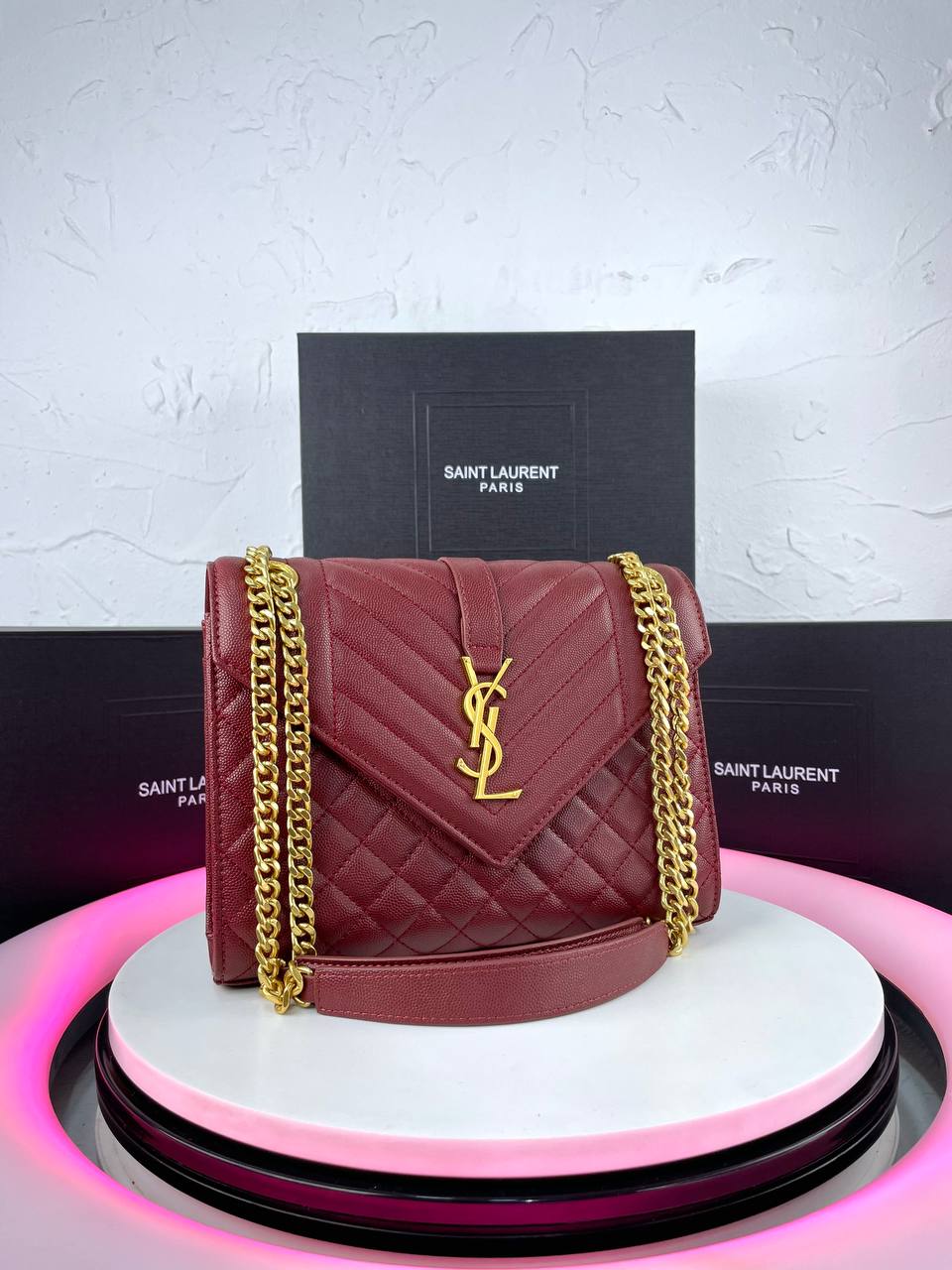 YSLتتميز بخامة جلد فاخرة منقوشة بخطوط ماسية تضيف لمسة فخامة راقية، مع شعار الذهبي البارز في المنتصف وسلسلة معدنية ذهبية مزدوجة تضفي طابعًا عصريًا جريئًا.