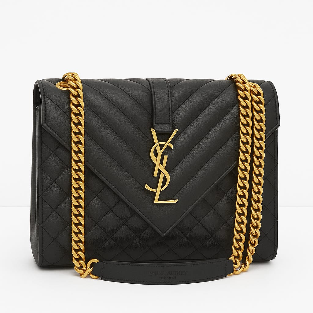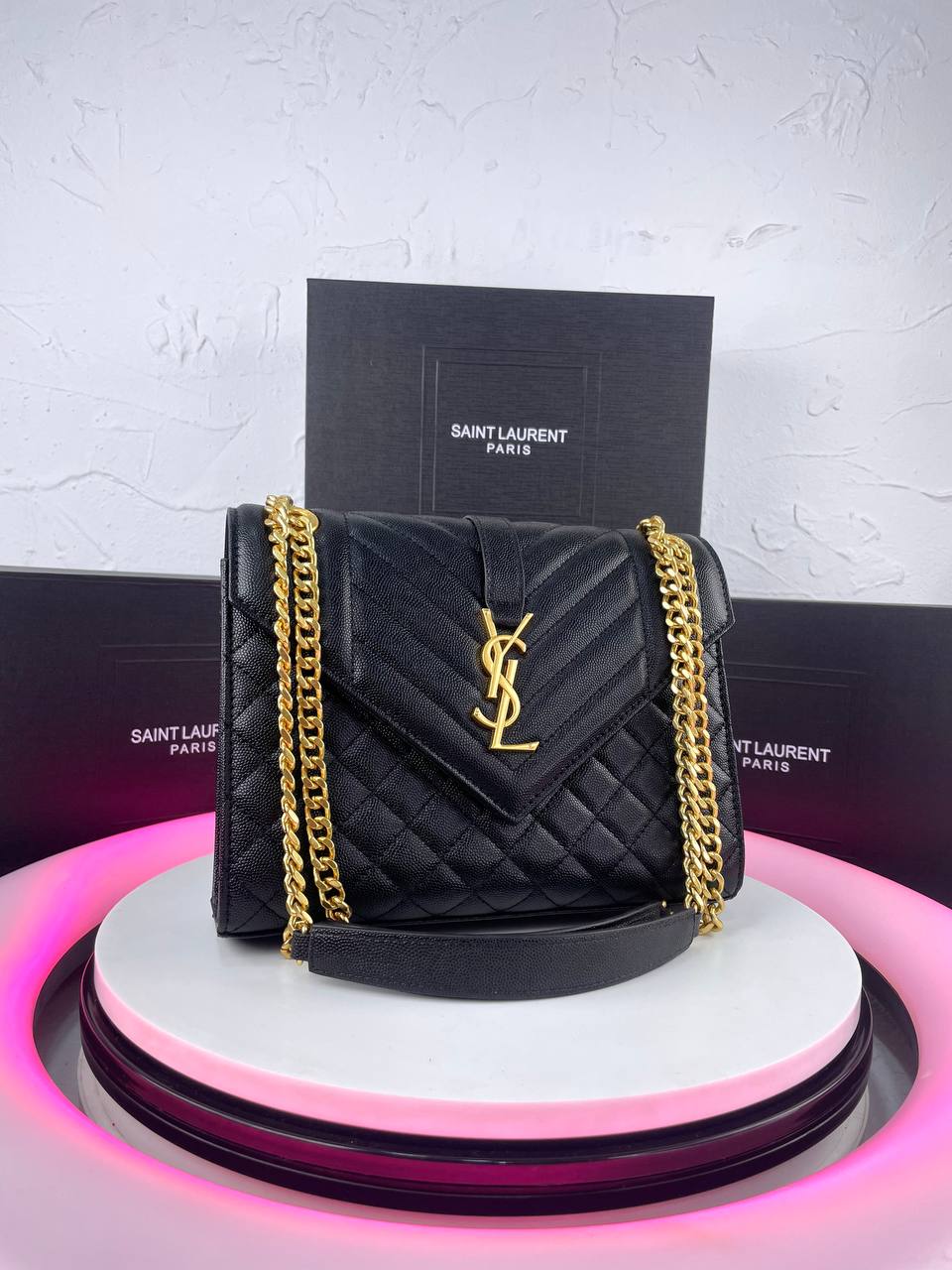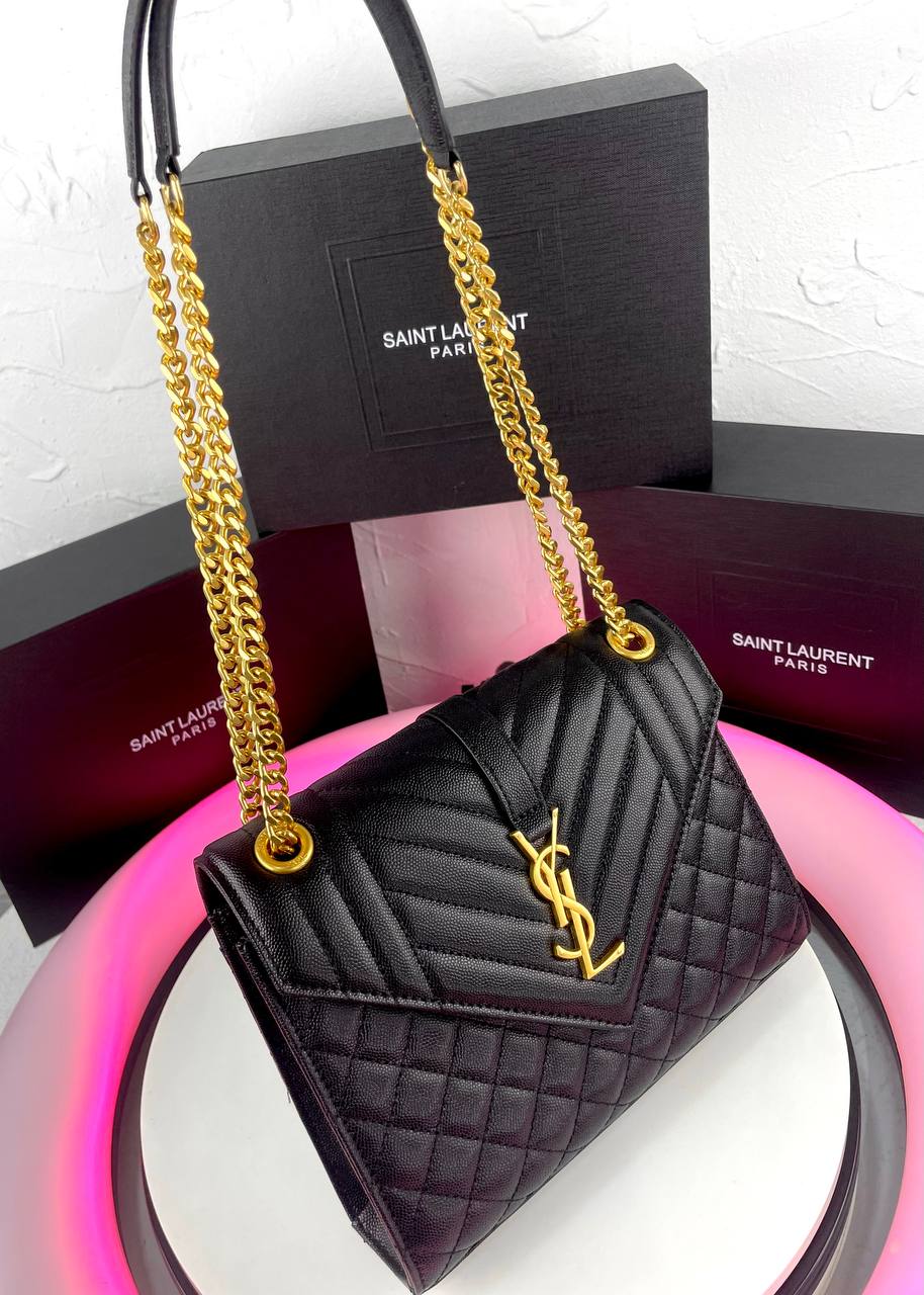 Crafted from premium quilted leather with a diamond pattern, it features the signature gold YSL logo on the flap and bold double gold chains, offering a perfect mix of classic luxury and modern style.