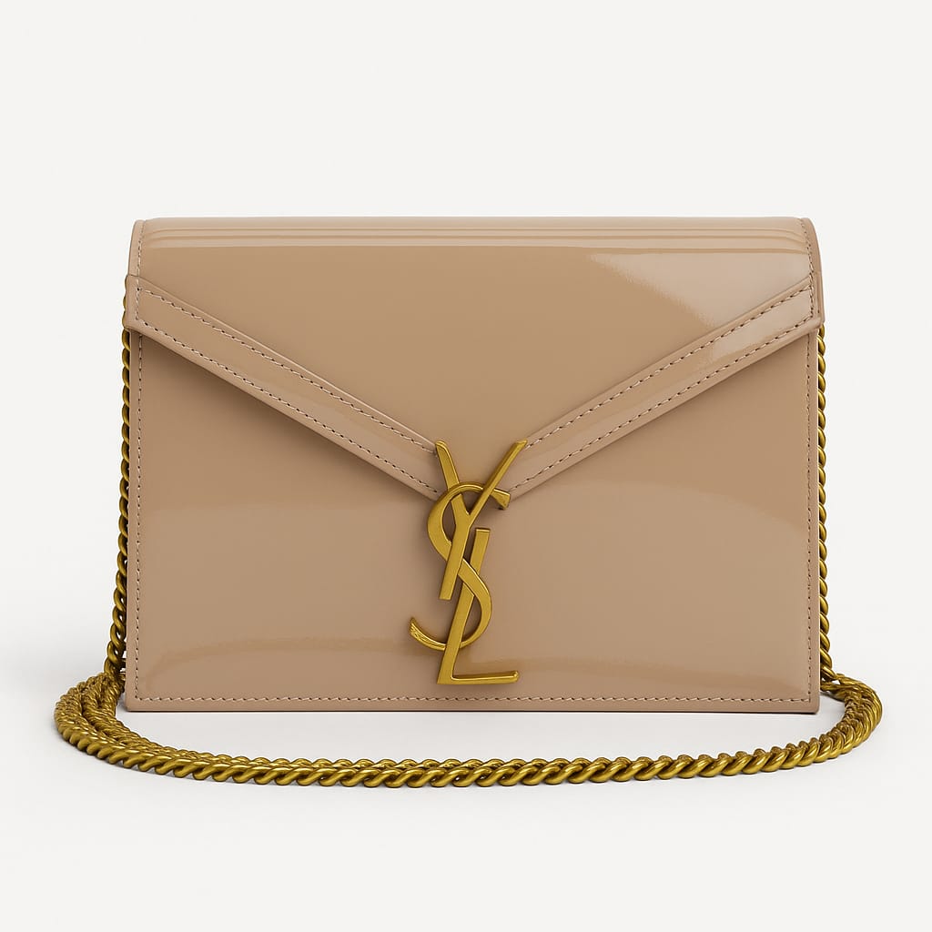 مصنوعة من خامات عالية الجودة بلمعة مميزة وتفاصيل ذهبية أنيقة، مع سلسلة معدنية باللون الذهبي تضيف لمسة كلاسيك راقية.