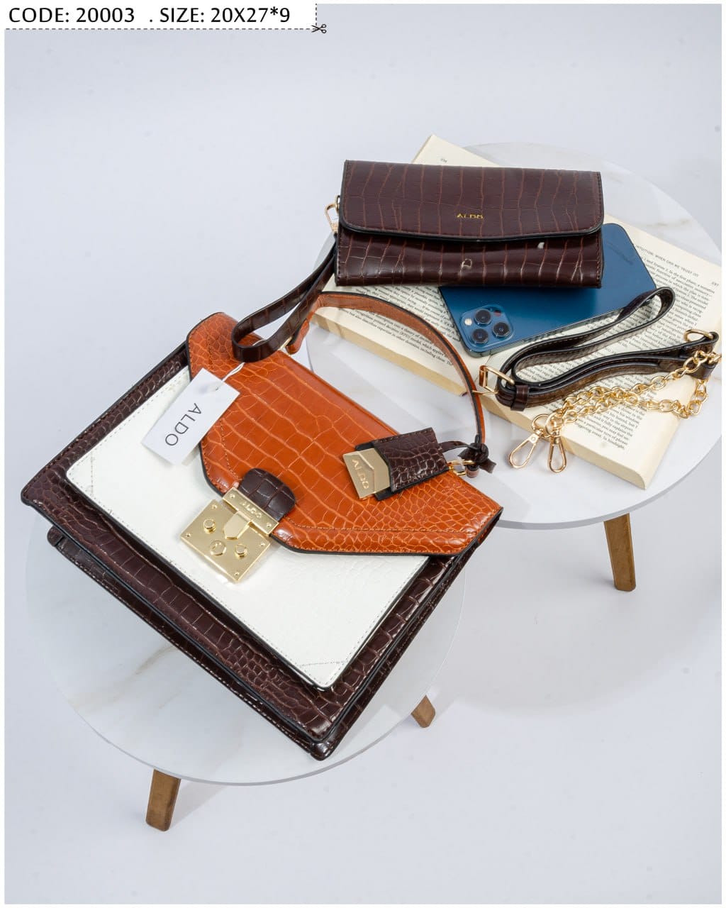 شنطة يد كروك إيليجانس هي قطعة فاخرة تجمع بين الأناقة الكلاسيكية واللمسة العصرية، صُممت خصيصًا للمرأة العاشقة للتميز. تأتي بتصميم هندسي أنيق يمزج بين اللون البني الداكن، الأبيض الكريمي، والبرتقالي الدافئ، ما يمنحها حضورًا لافتًا ومميزًا.