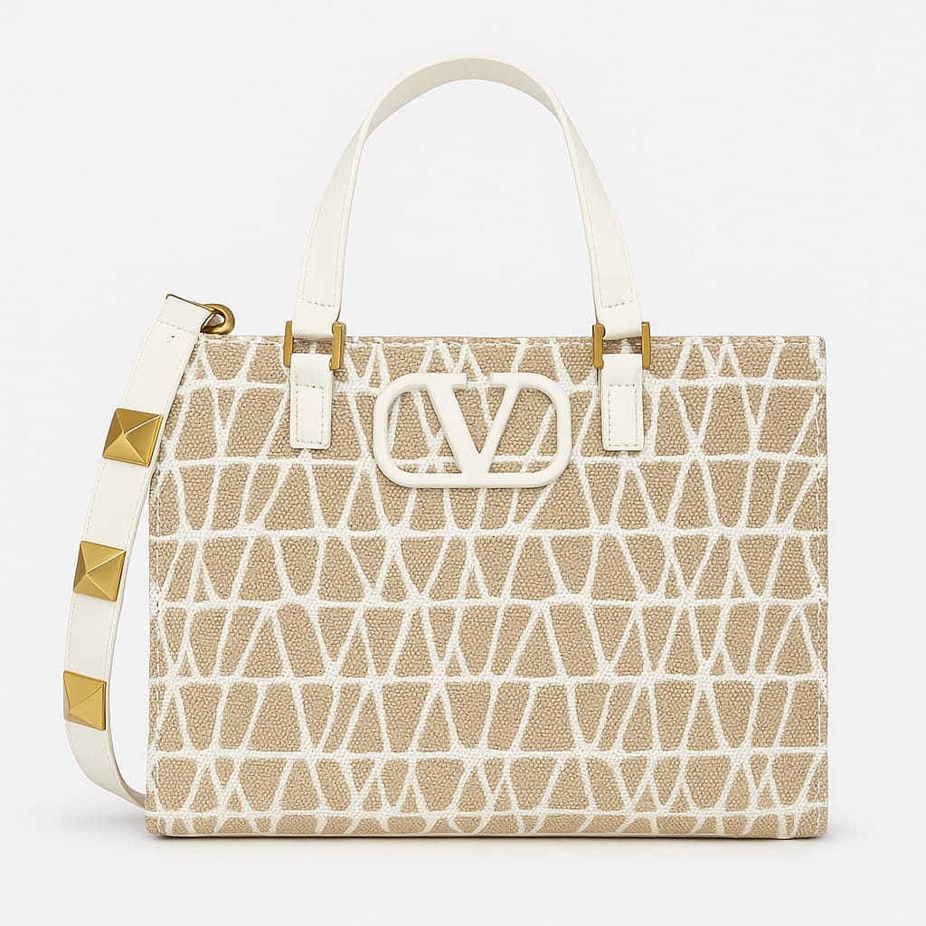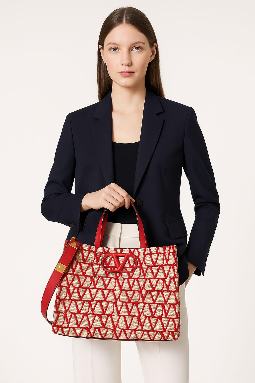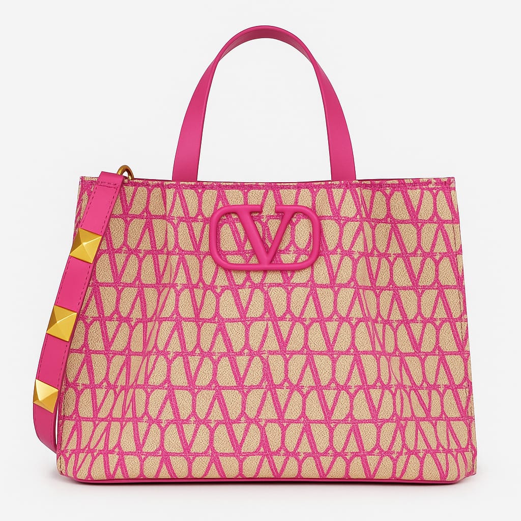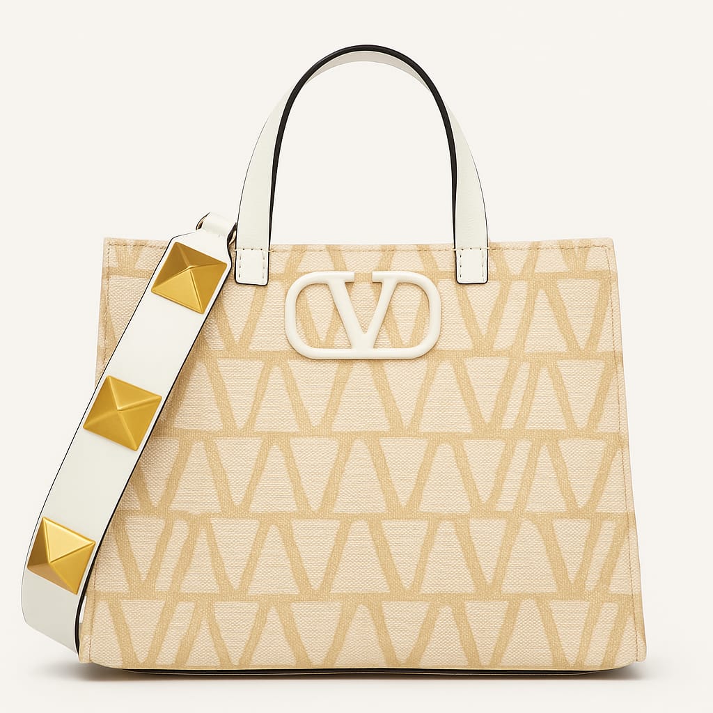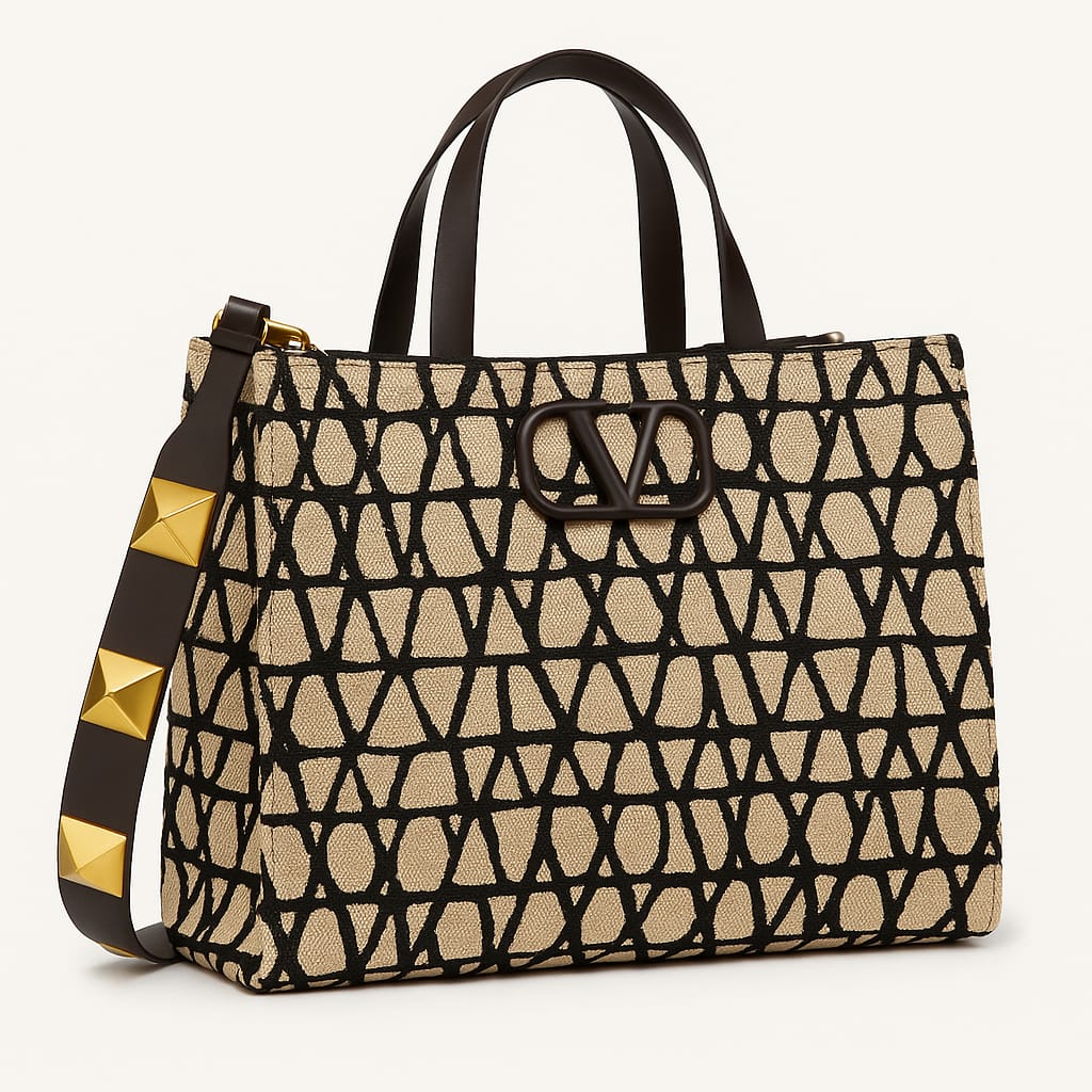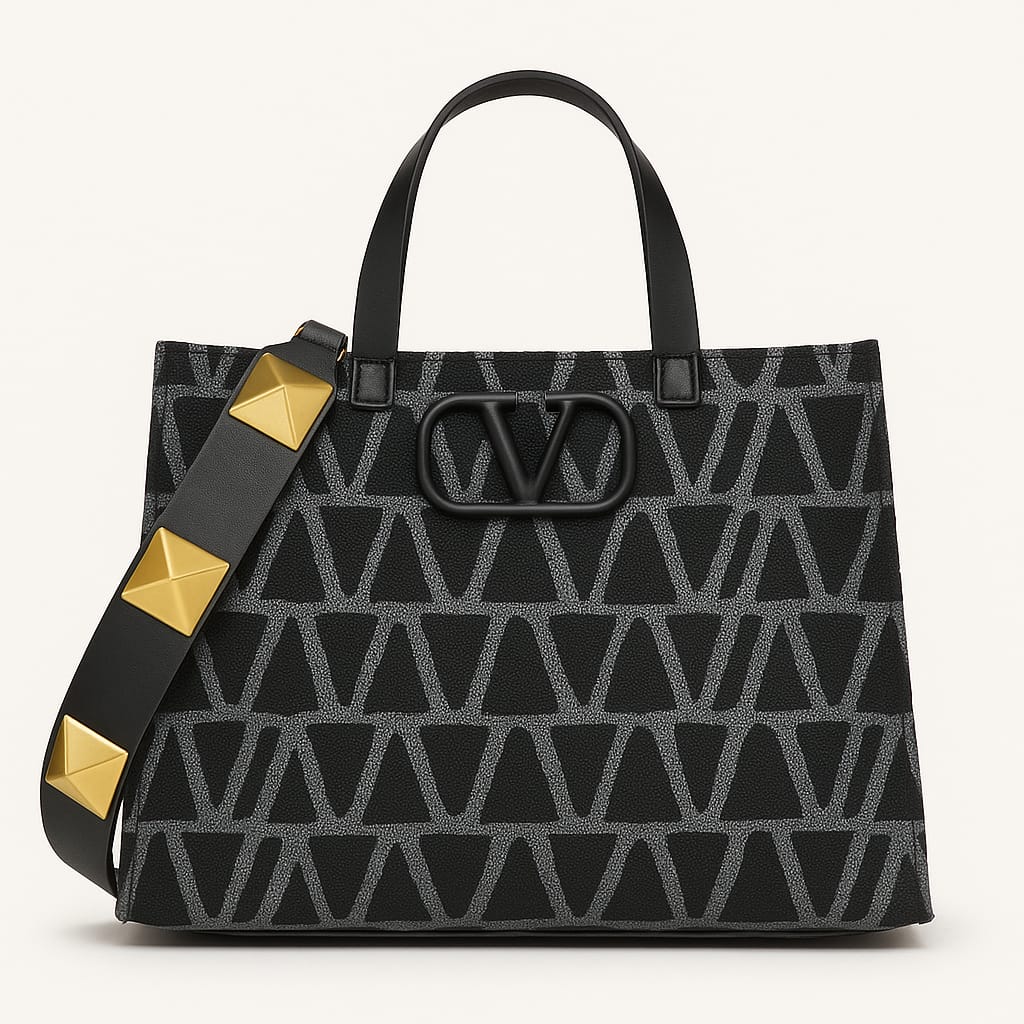 The Valentino Icon Tote perfectly balances Italian luxury with everyday practicality, featuring the bold V-logo and wide shoulder strap adorned with iconic golden studs.