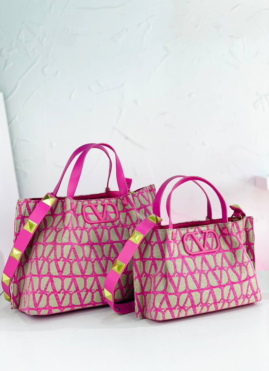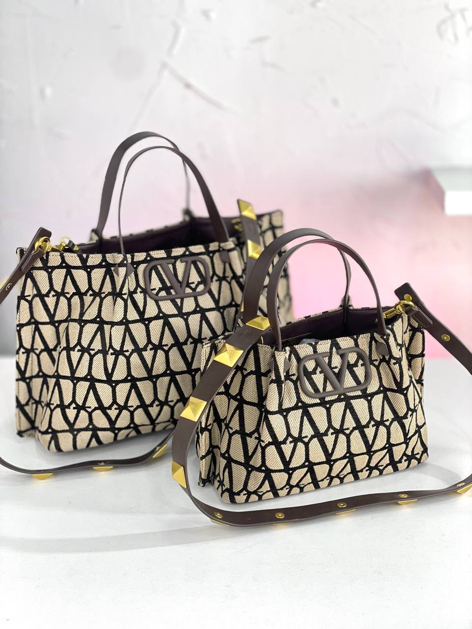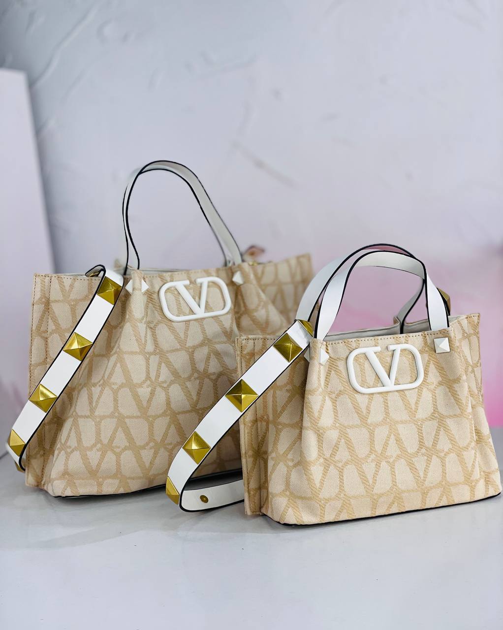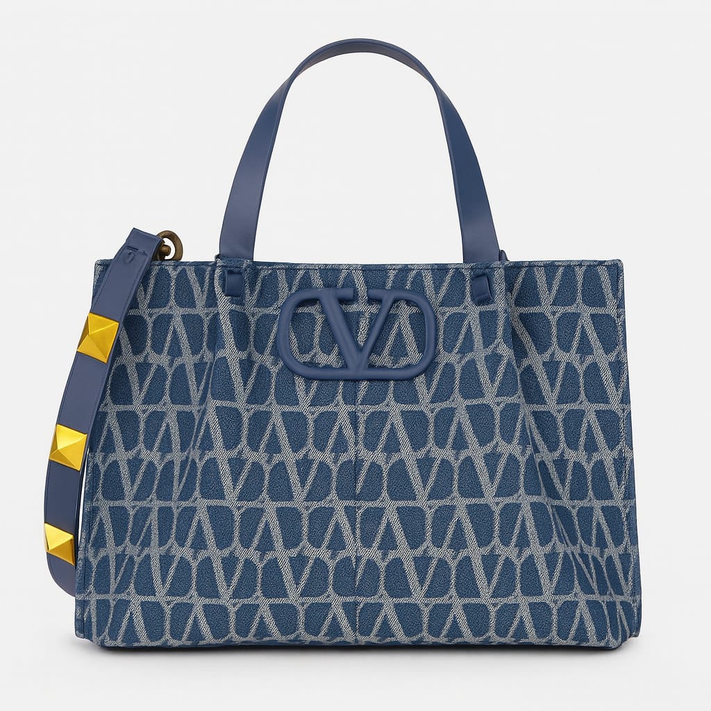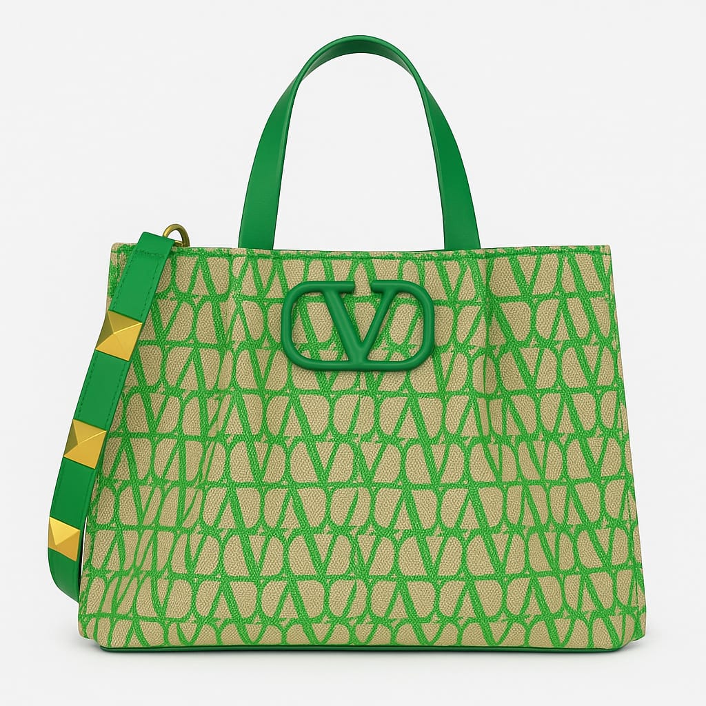 The Valentino Icon Tote perfectly balances Italian luxury with everyday practicality, featuring the bold V-logo and wide shoulder strap adorned with iconic golden studs.