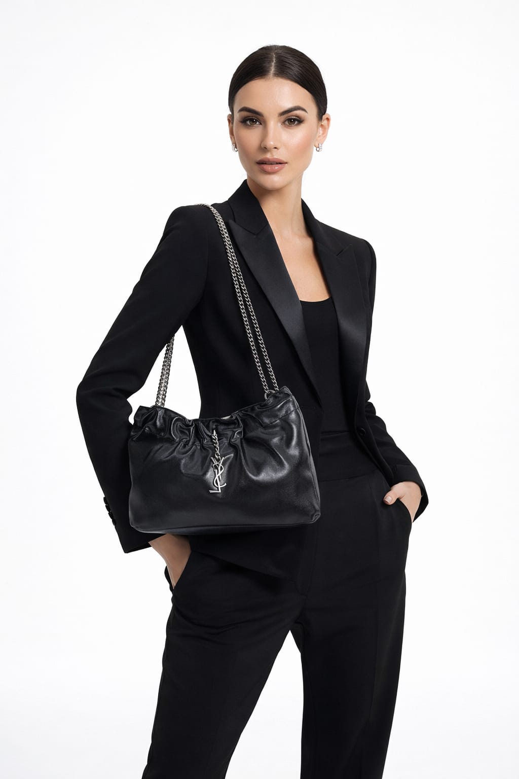 With its ideal size 24×16 cm, it fits your essentials—phone, wallet, keys, and a few makeup items—without feeling bulky. The gathered top design gives it a modern, fashion-forward vibe, while the iconic metal YSL logo detail brings a refined designer finish.